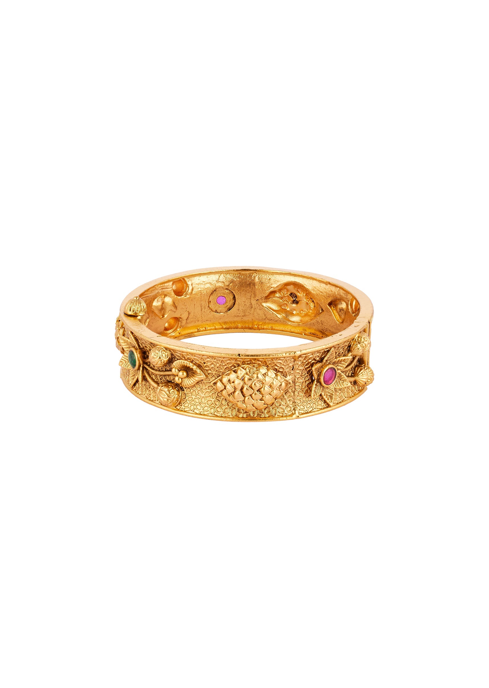 Gold Finish Temple Style Bangle With Rani Pink and Green Simulated Stones