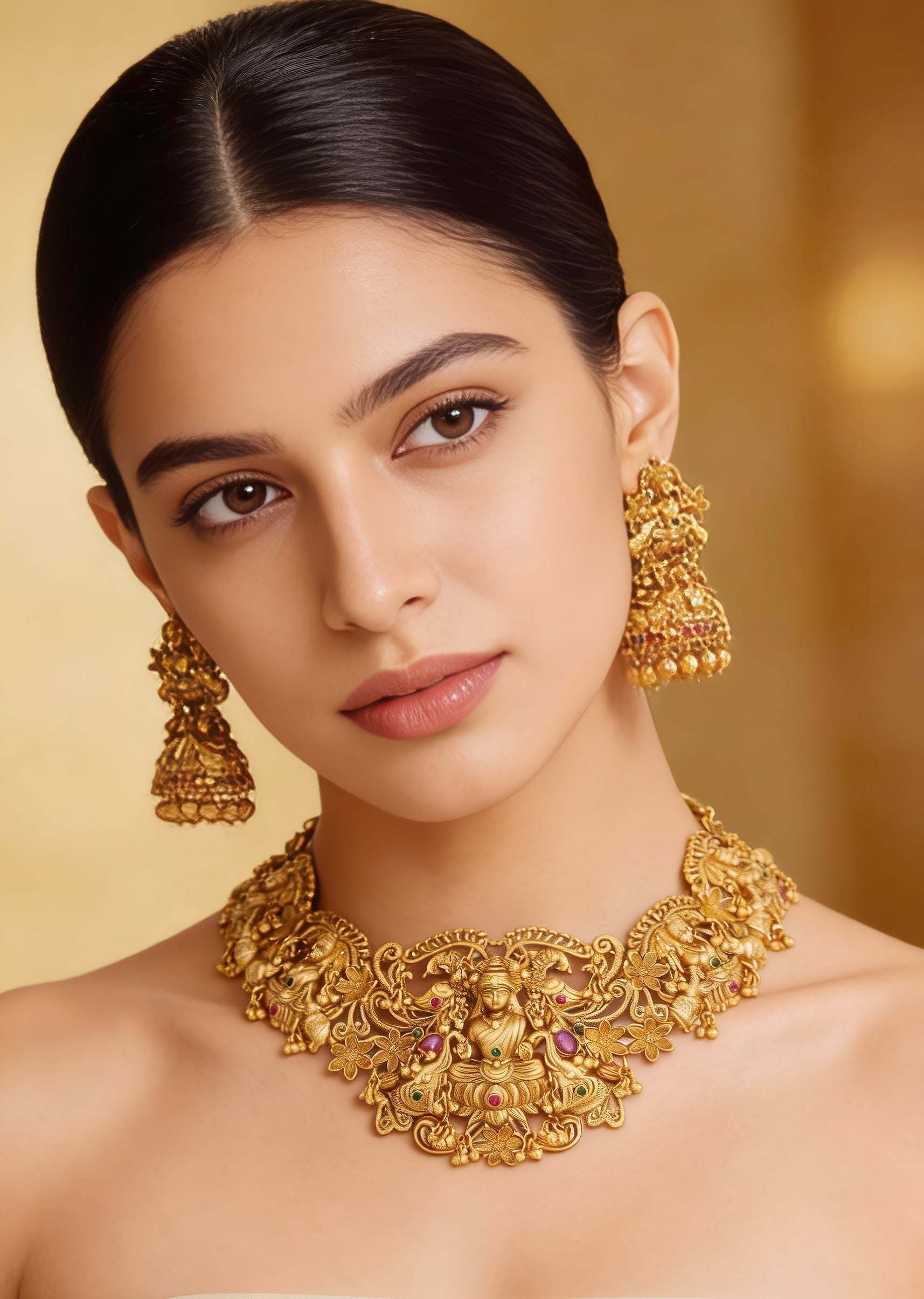 A traditional temple inspired jewellery set crafted in a rich gold finish. The design showcases heritage style motifs accented with simulated green and pink stones that add a festive yet elegant touch. Ideal for weddings and celebratory occasions, this set enhances bridal and family looks with timeless traditional charm.