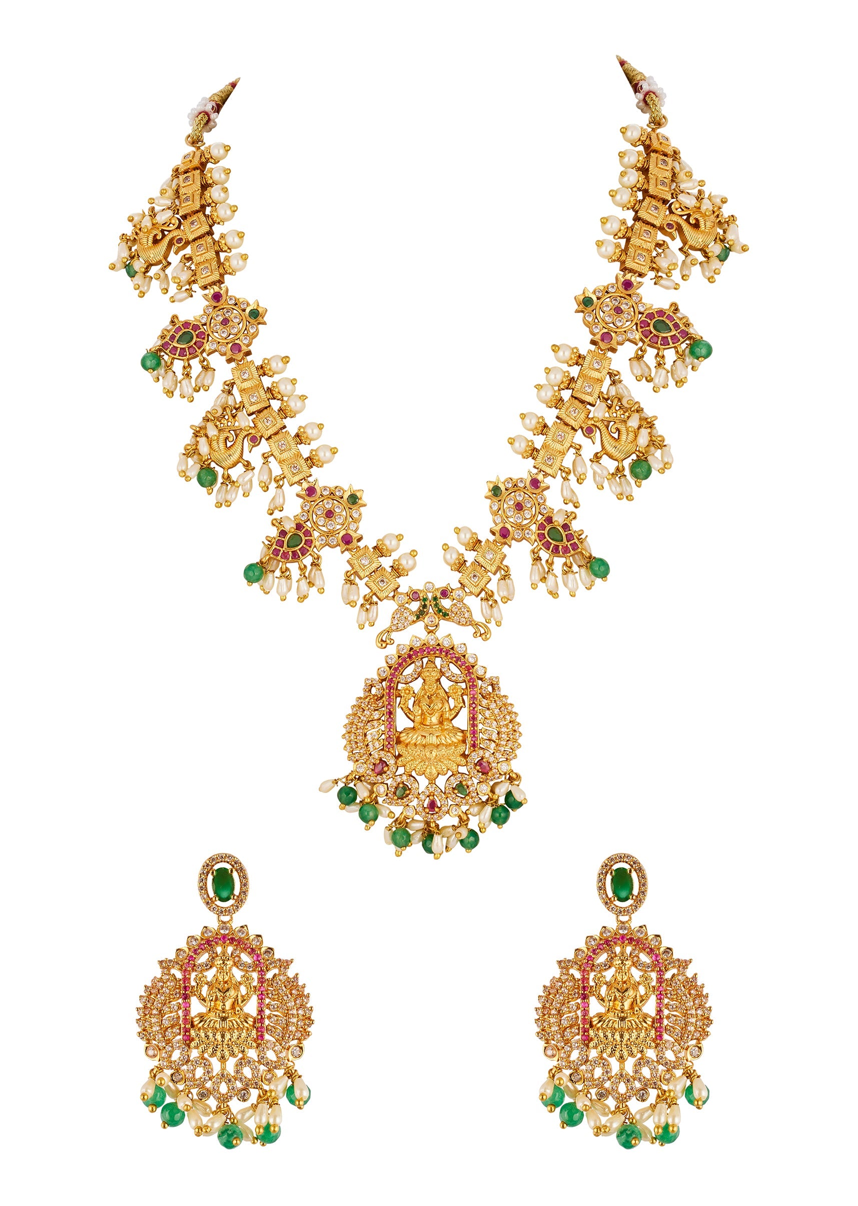 Gold Finish Temple Style Necklace Set With Green and Pink Simulated Stones And Zirconia Accents