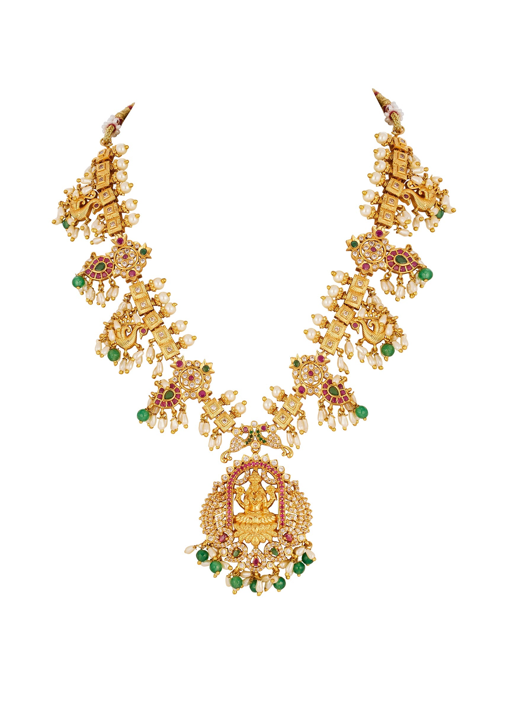 A beautifully crafted gold necklace set featuring intricate traditional temple motifs accented with green and pink simulated stones and sparkling zirconia. The combination of vibrant stones and shimmering accents creates a festive and elegant statement, perfect for weddings and celebratory occasions. Awarded as the Most Trusted Brand, we're delivering styles you love, just as promised.