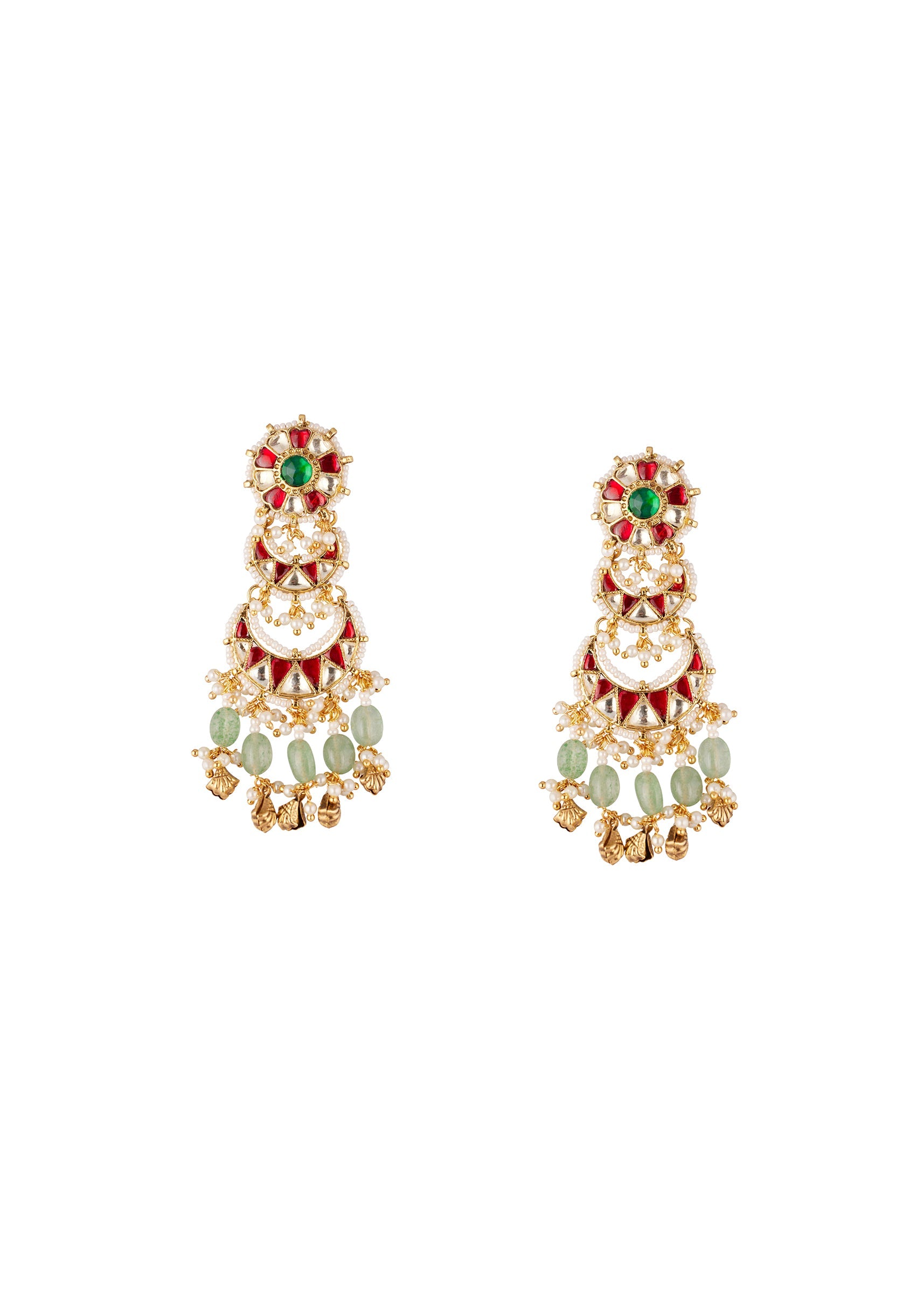 Gold Finish Three Tiered Chandbali Earrings With Kundan Work Red Enamel Accents Moti Beads And Green Hanging Stones