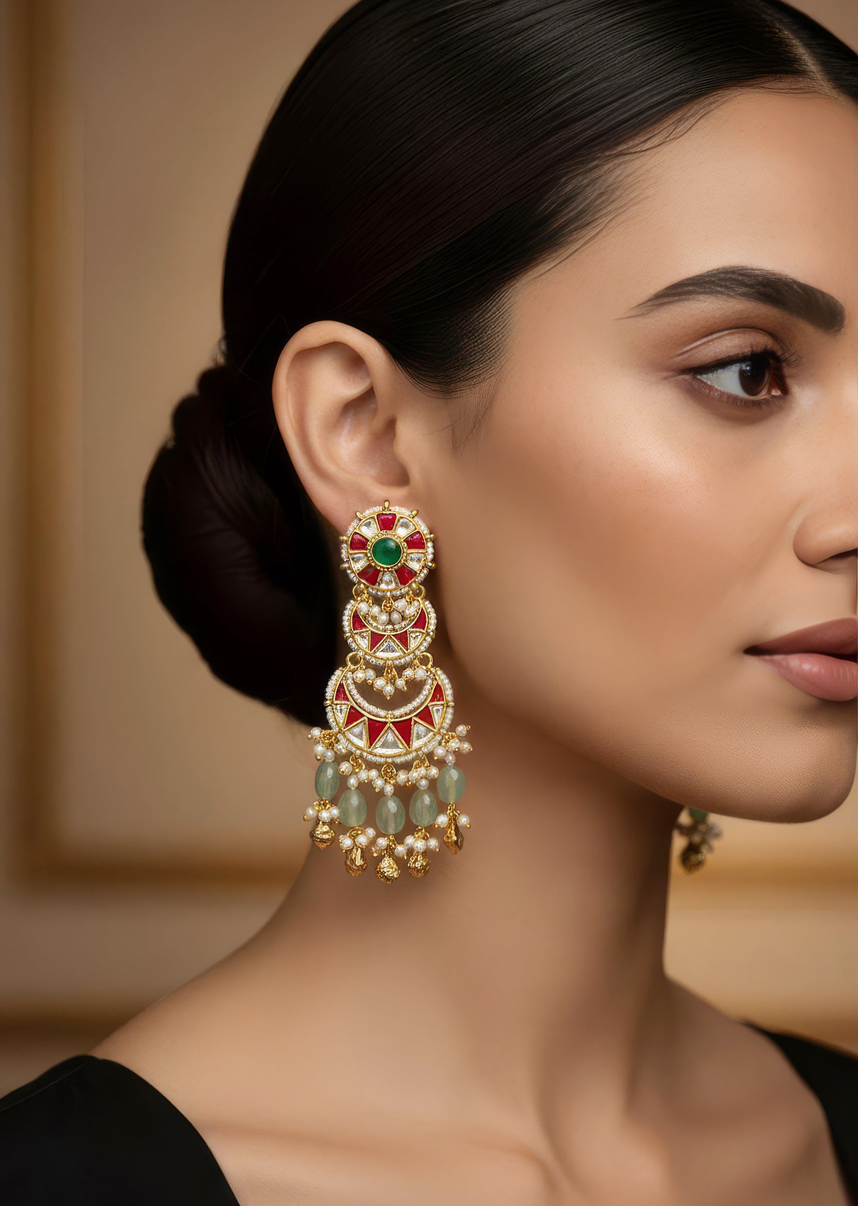 : Pair them with a green or red lehenga or an anarkali to complement the enamel accents and enhance the traditional charm.