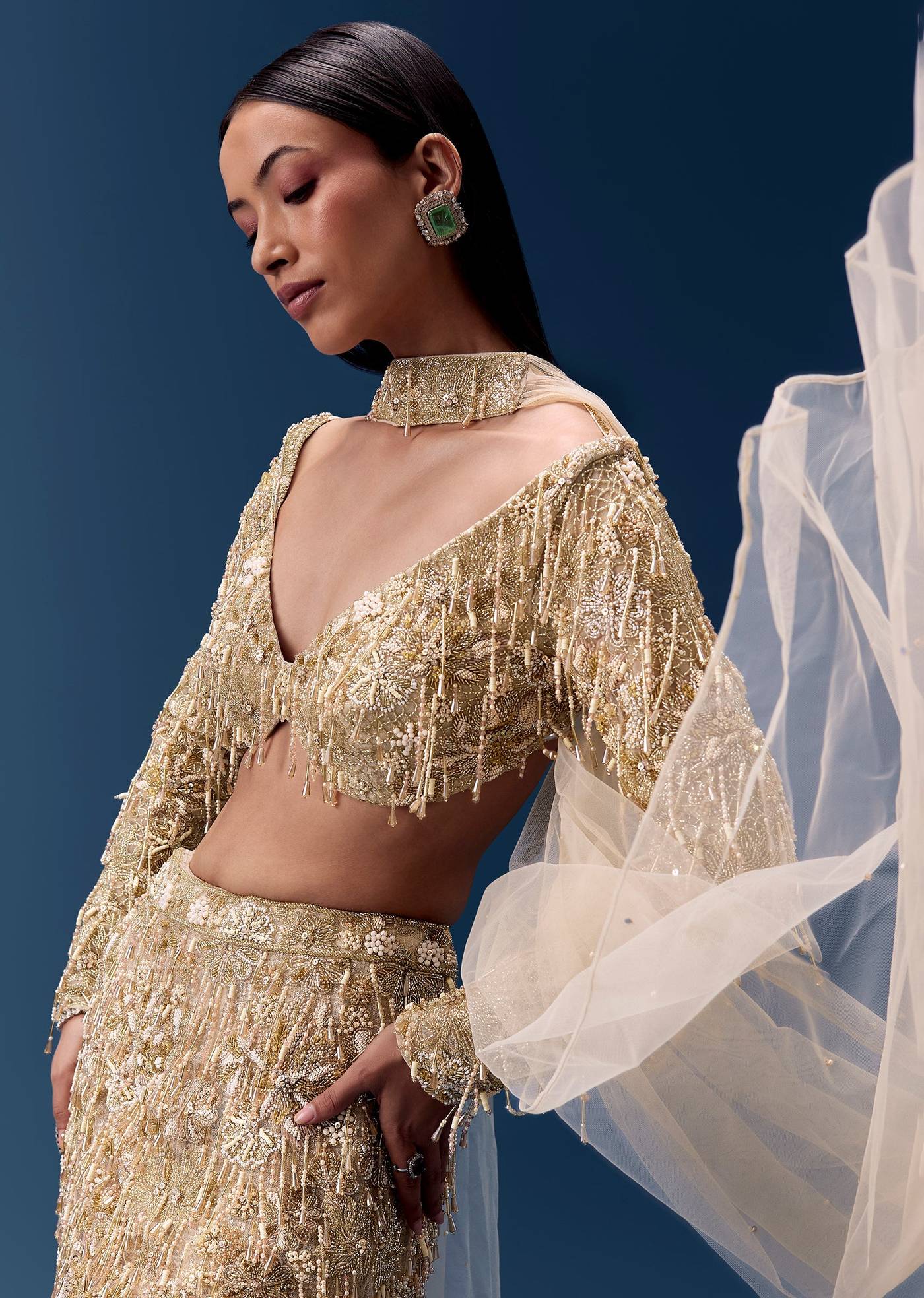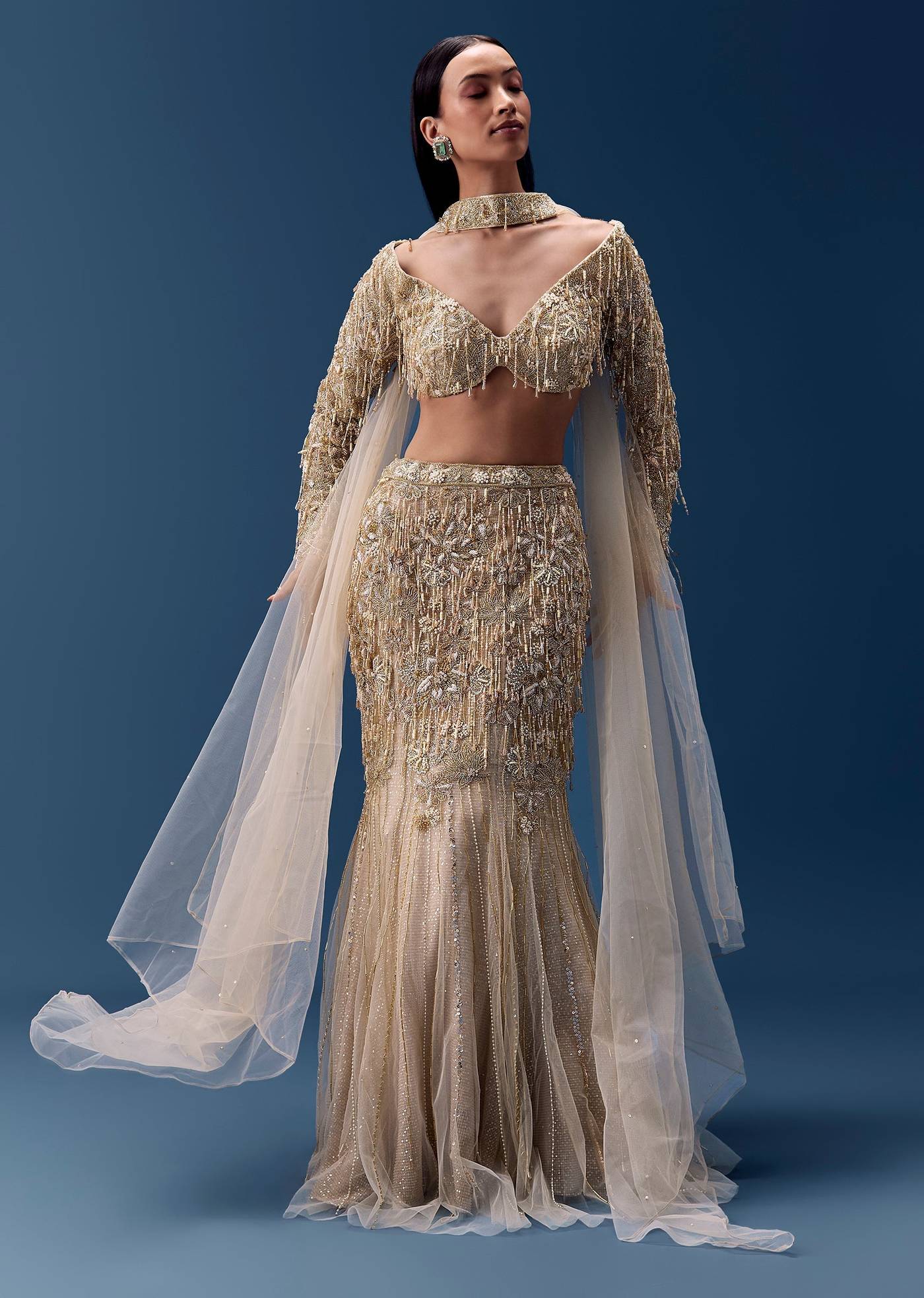 Gold Fishcut Lehenga with Blouse and Choker Dupatta