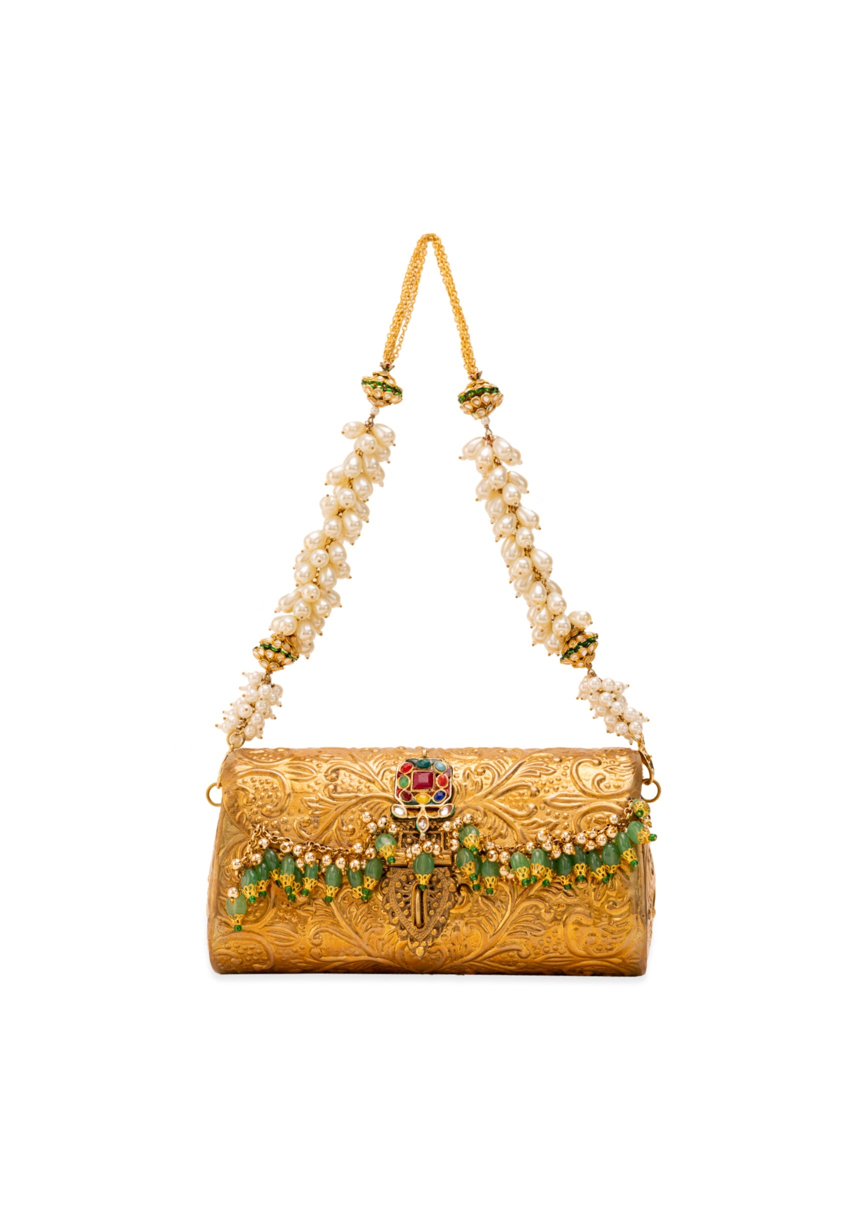 Add a touch of regal charm with this gold metal bag, beautifully crafted with floral embossed textures that catch the light effortlessly. Its elegant sheen and intricate detailing make it... More Product Details