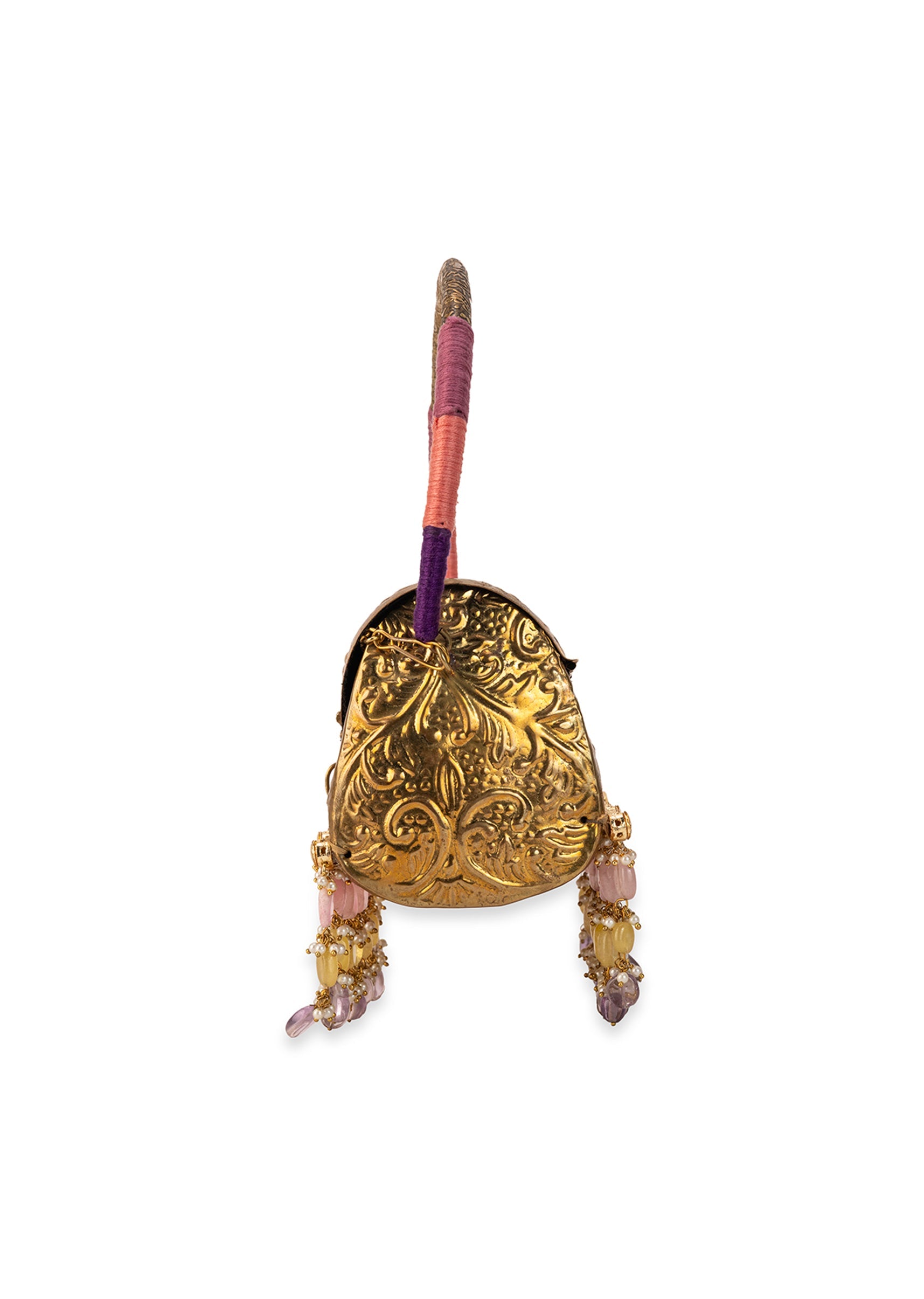 Intricate floral engravings give this gold metal bag a beautifully sculpted, heirloom inspired charm. The embellished finish and rich golden sheen make it ideal for weddings, festive nights, and elegant... More Product Details