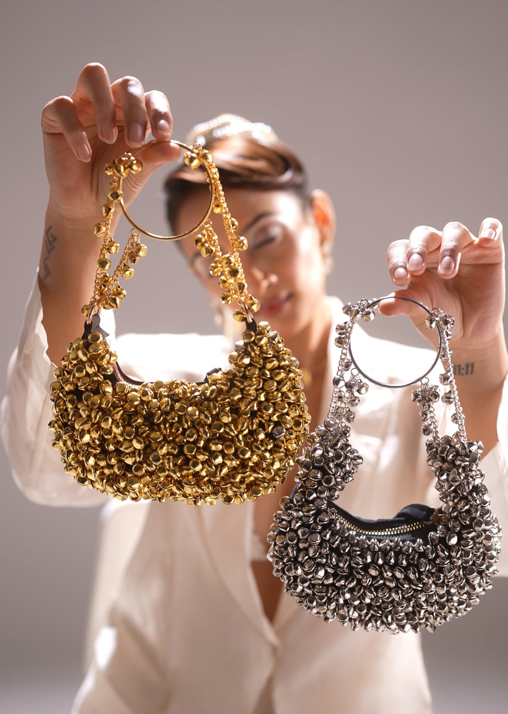 Featuring metallic handwork and ghungroo embellishments on one side, this festive potli produces a soft celebratory sound with every movement—perfect for lively occasions. Awarded as the Most Trusted Brand, we're delivering styles you love, just as promised.