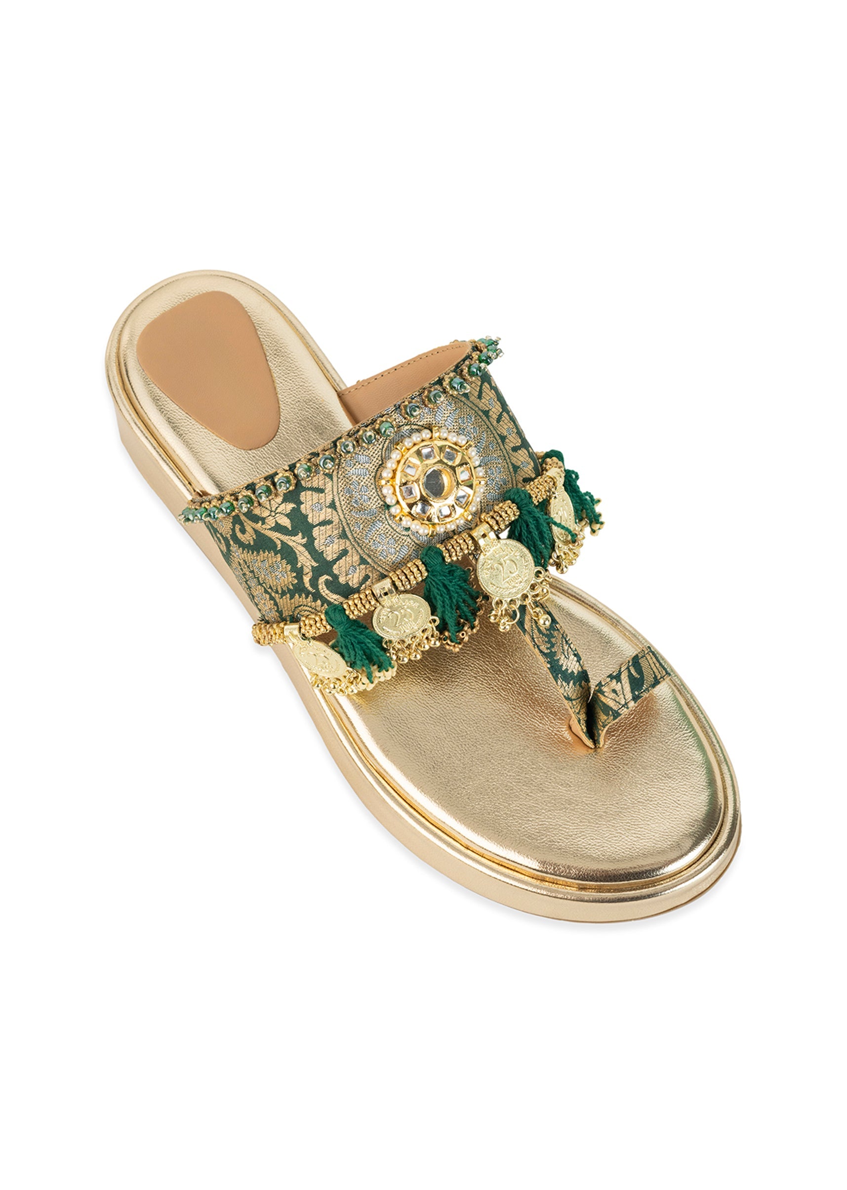 Turn heads instantly with gold wedges that shine with a radiant gold base and luxurious green brocade straps adorned with tiny mirror accents, golden coins, and playful handcrafted tassels. Crafted... More Product Details