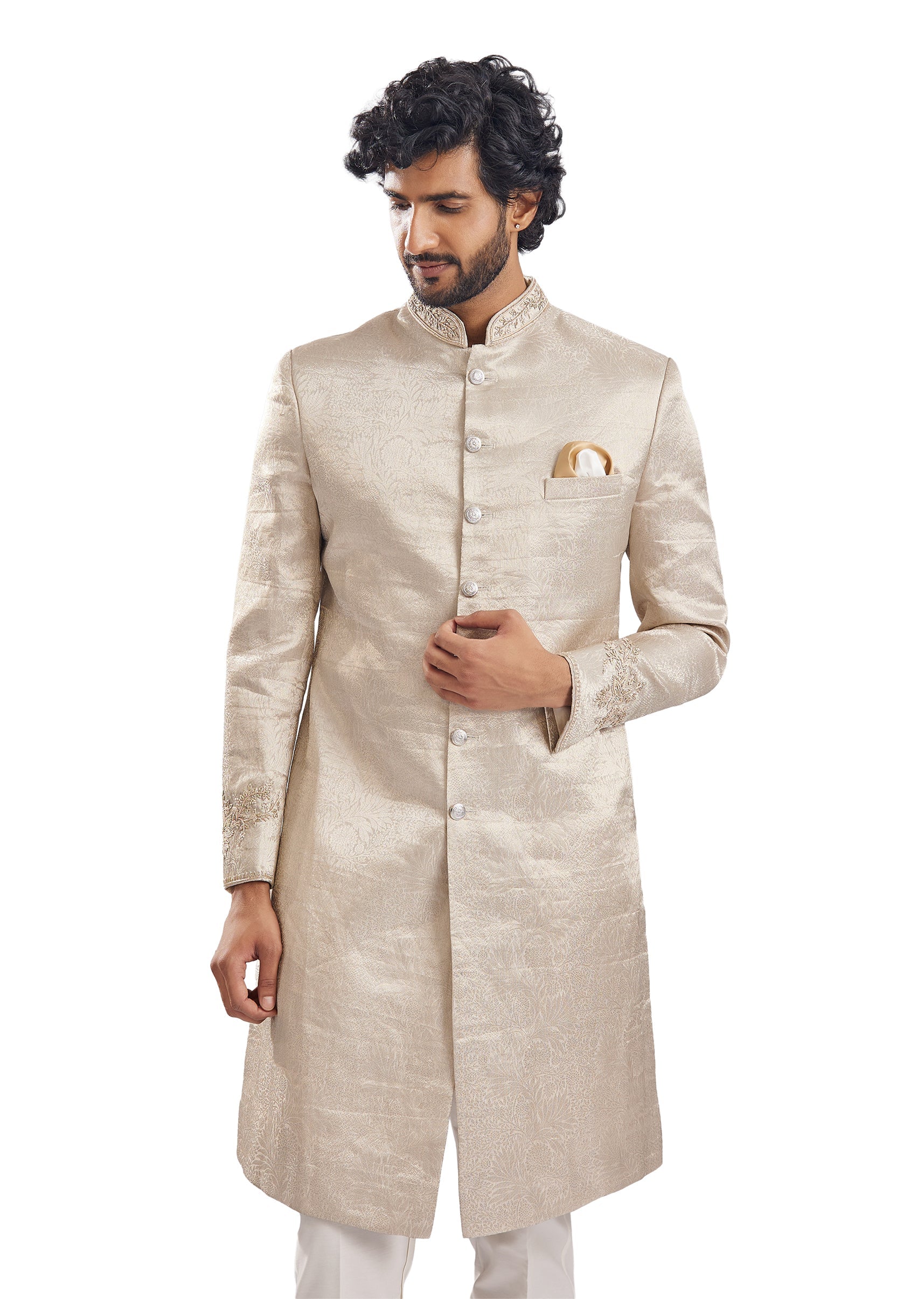 Opulent and commanding, this gold silk and jacquard sherwani is adorned with thread and resham embroidery that enhances the richness of its self-pattern fabric for a truly elevated mehendi look.... More Product Details