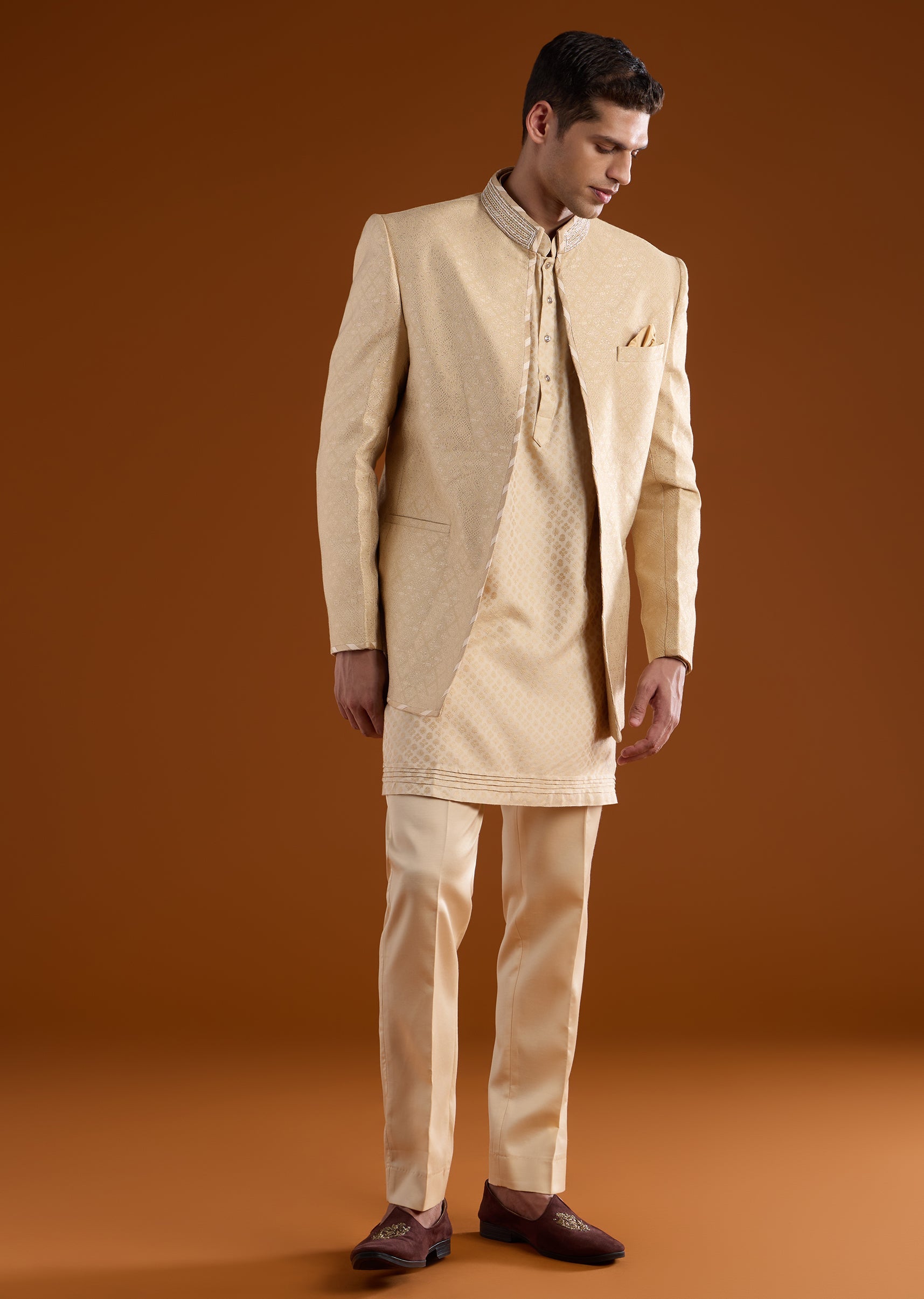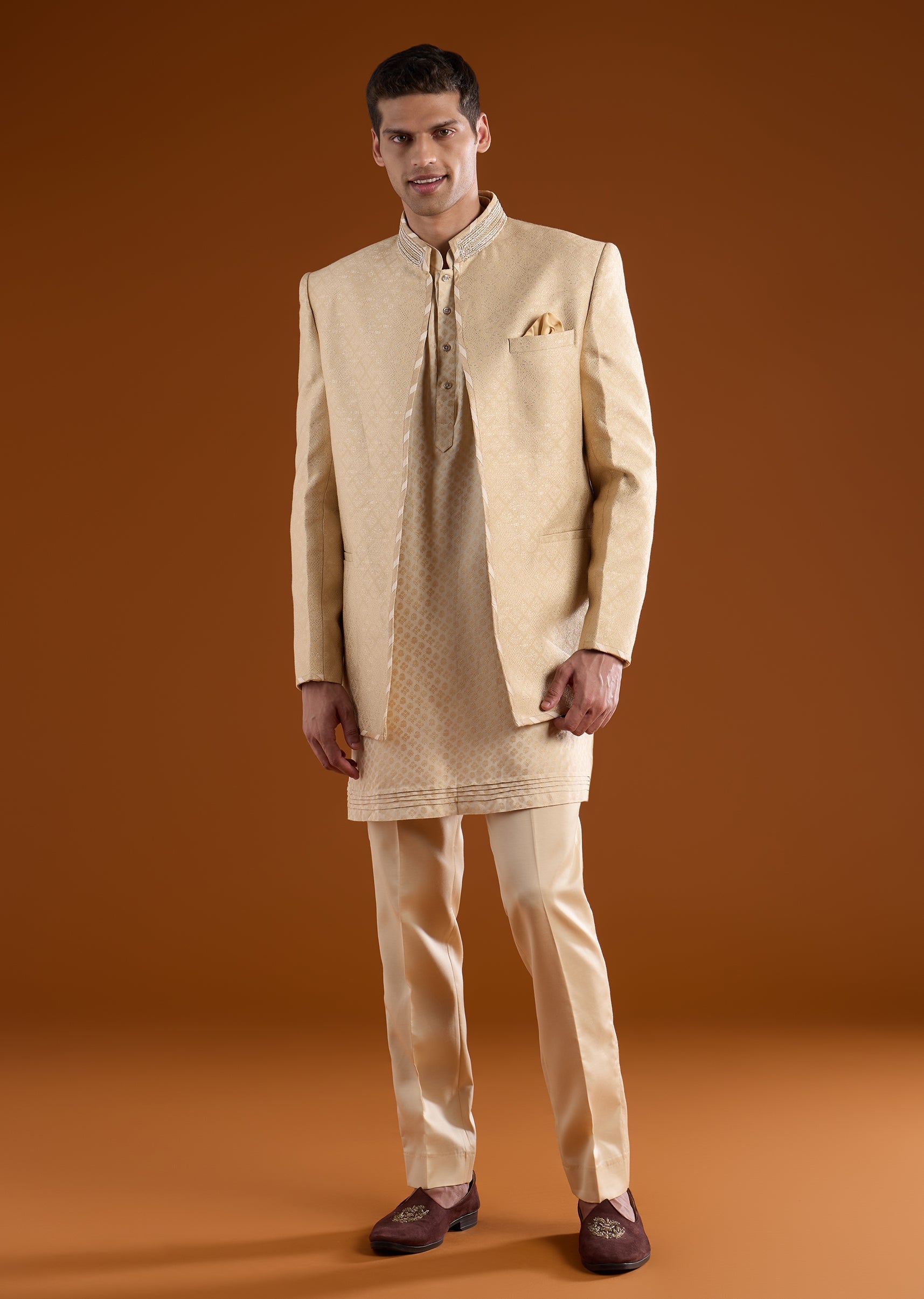 Gold Jacquard Mens Kurta Jacket Set With Thread Moti And Cut Dana Work