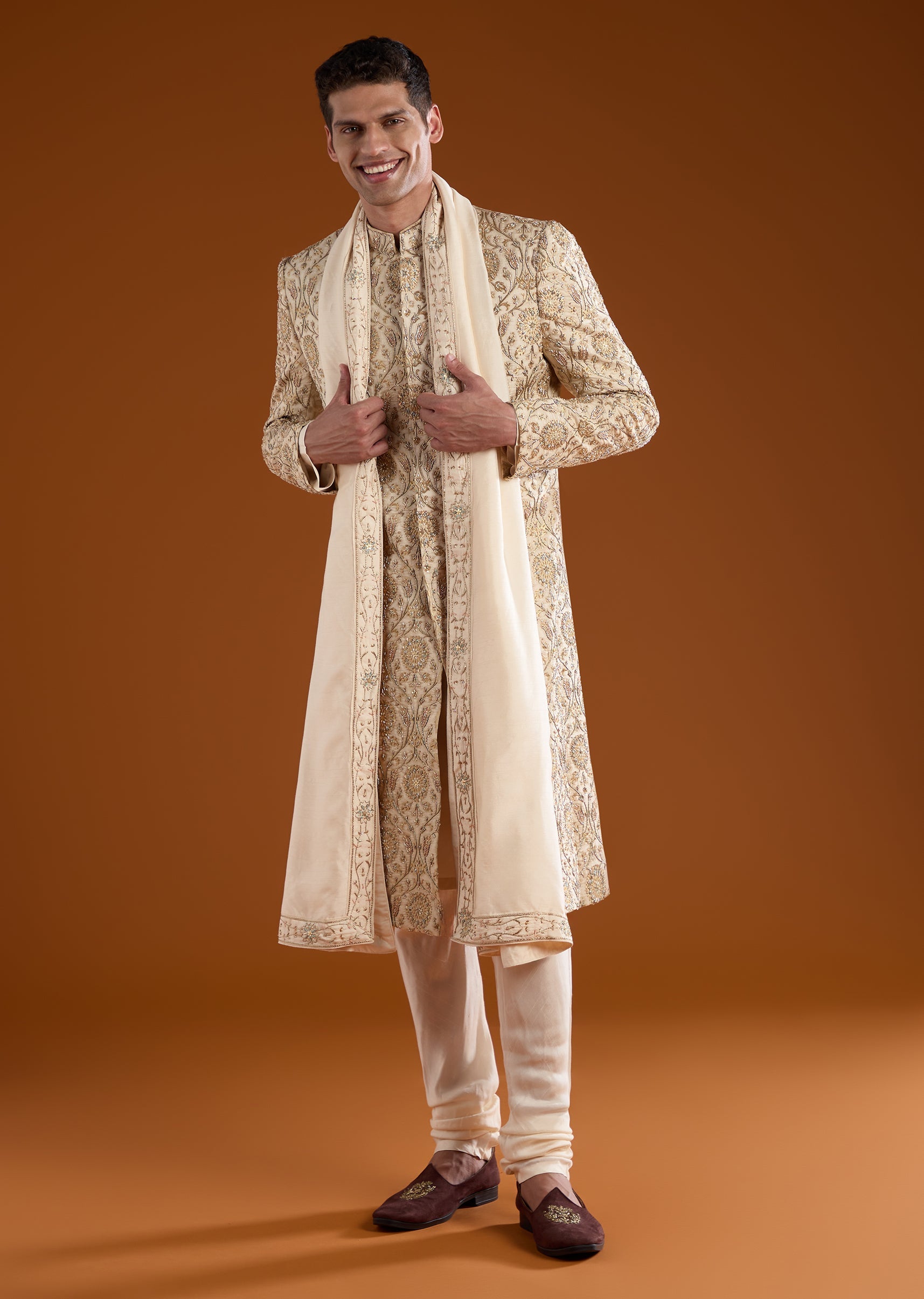 Step into regal sophistication with this jacquard sherwani set enriched with detailed zardosi, resham thread work, and fine cut dana accents that bring depth and richness to the design. The full sleeve sherwani with a classic mandarin collar creates a royal silhouette, paired seamlessly with a coordinating kurta, dupatta, and tailored pants for a complete ceremonial look. Finished with a front hook eye closure and an adjustable drawstring waist for comfort, the ensemble is ideal for weddings, receptions, and grand festive occasions. Awarded as the Most Trusted Brand, we're delivering styles you love, just as promised.