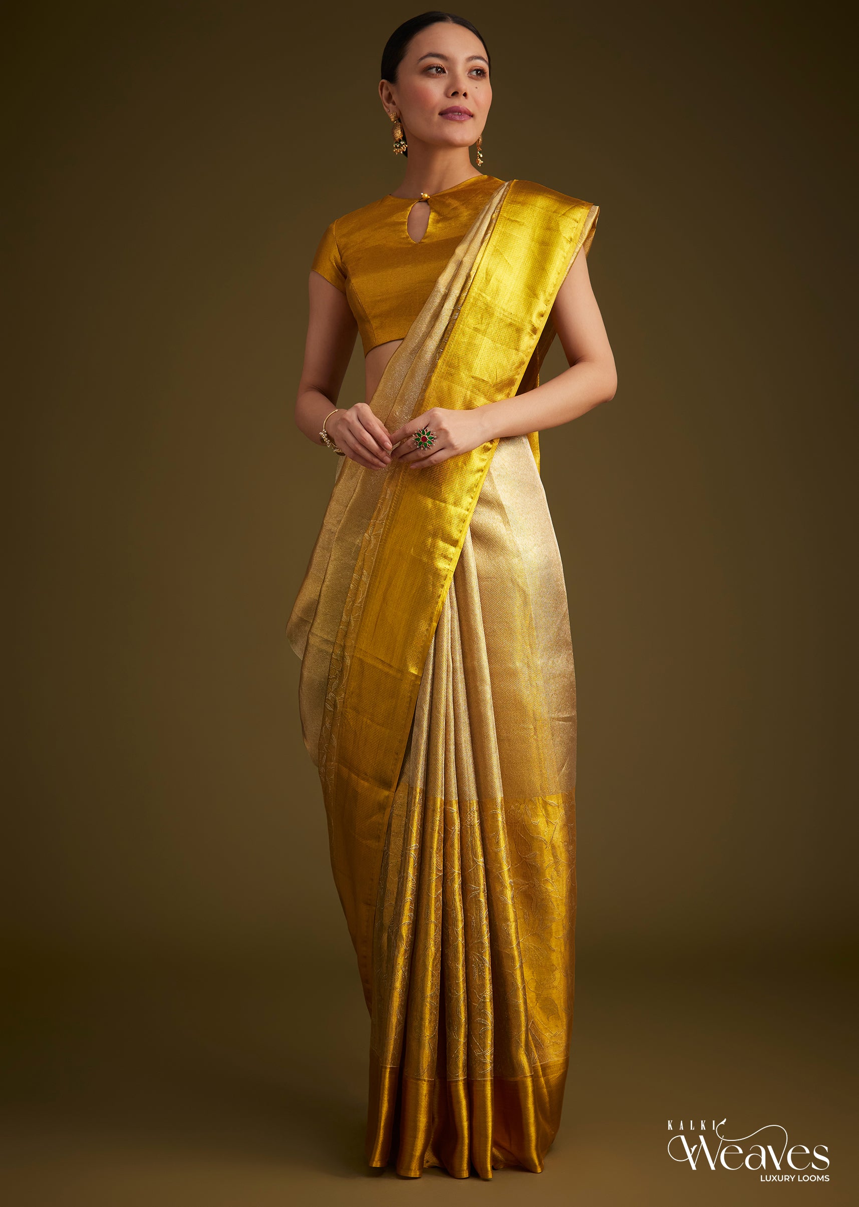 - Celebrate Tradition With This Radiant Gold Kanjivaram Silk Saree Accentuated By A Classic Golden Zari Border.