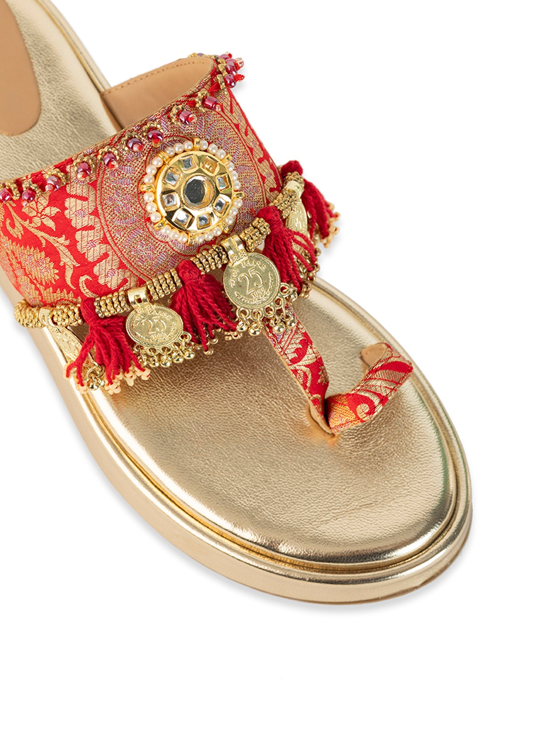 Step into the spotlight with gold wedges glowing in a regal red hue with a golden base and intricate brocade straps adorned with mirror work, gold coins, and playful handcrafted... More Product Details