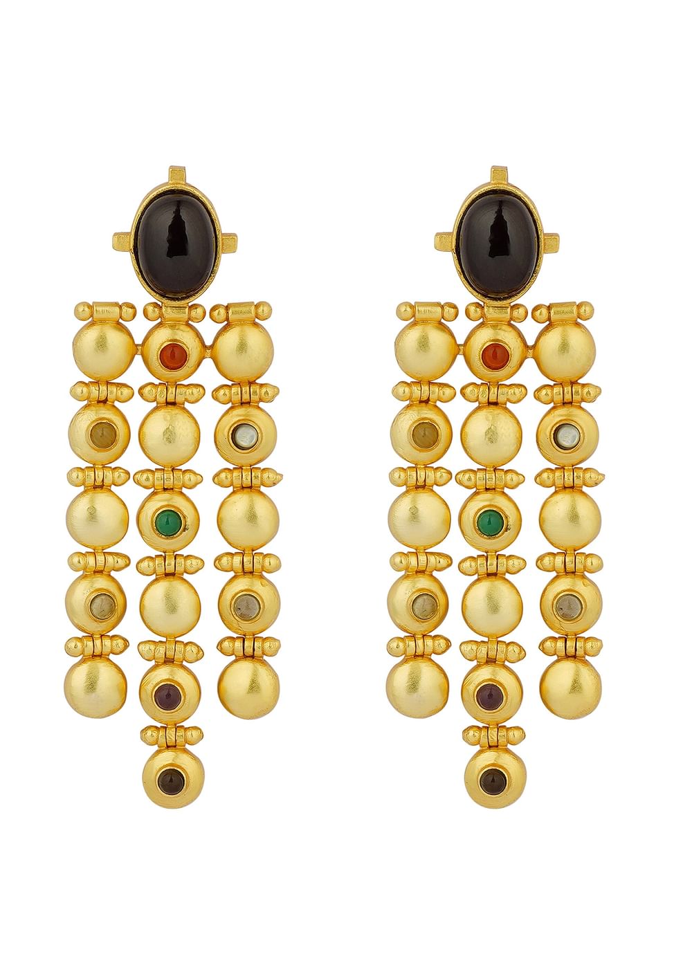 These Gold Navratna Earrings Feature Cascading Drops Adorned With Zircon Embellishments Offering A Bold And Elegant Design. Crafted From Mix Metal The Intricate Details And Vibrant Accents Make Them Ideal For Party Occasions.Awarded As The Most Trusted Brand We'Re Delivering Styles You Love Just As Promised.