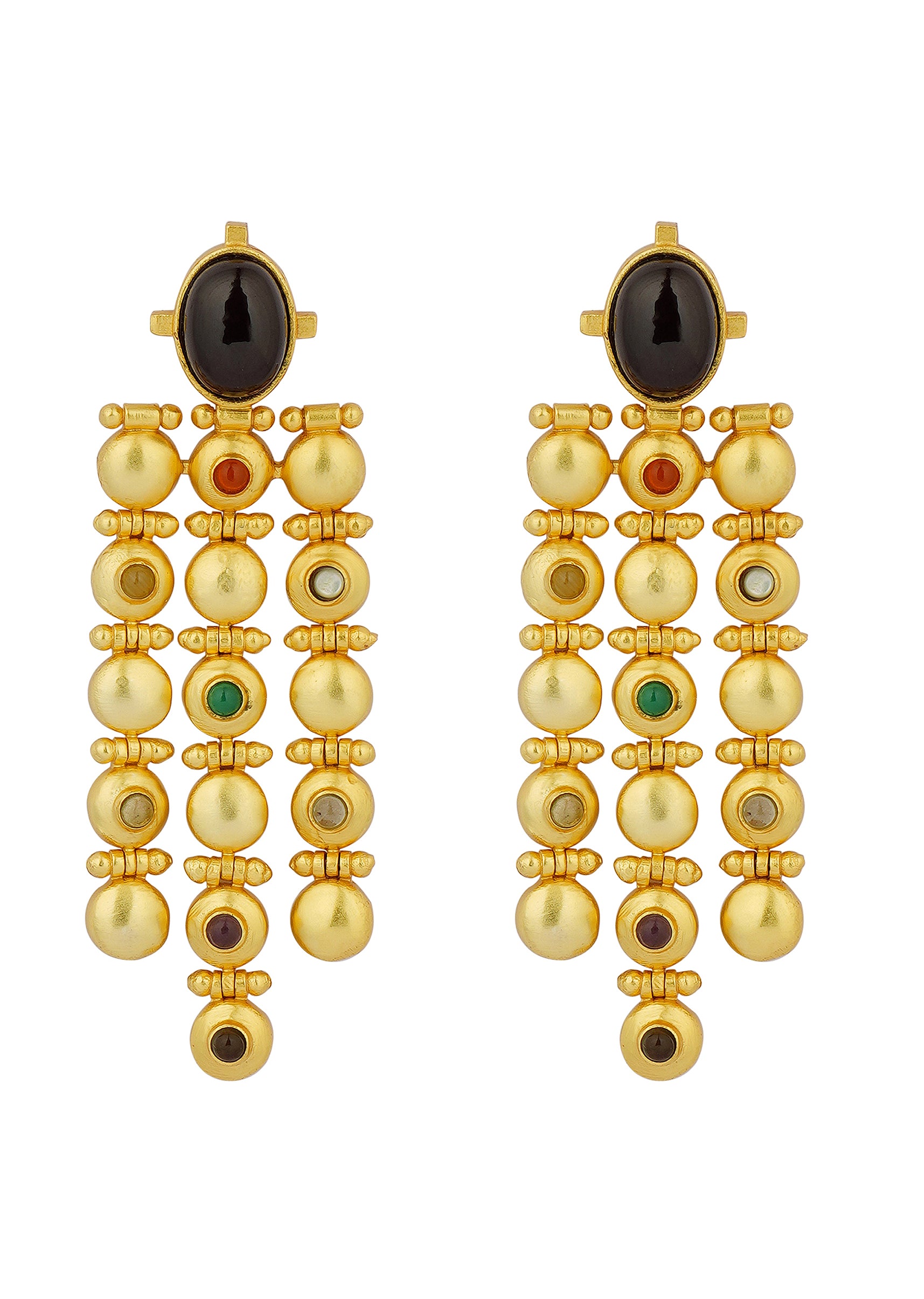 These Gold Navratna Earrings Feature Cascading Drops Adorned With Zircon Embellishments Offering A Bold And Elegant Design. Crafted From Mix Metal The Intricate Details And Vibrant Accents Make Them Ideal... More Product Details