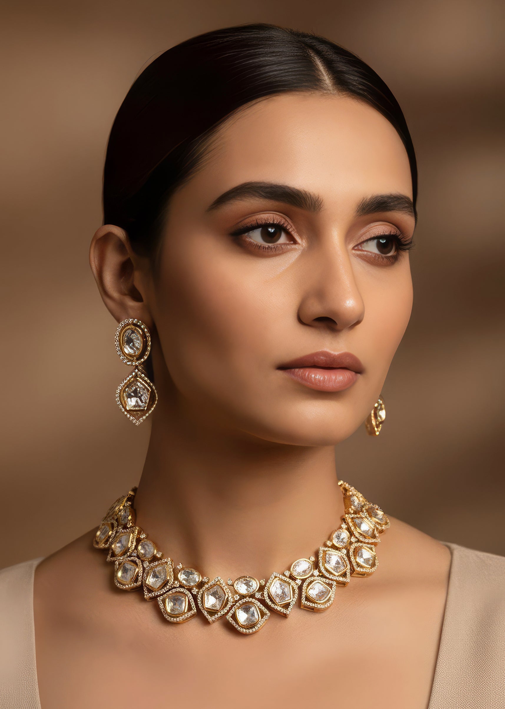 A refined gold and white necklace set embellished with Polki uncut diamonds, crafted using the traditional Kundan Jadau technique. This handcrafted Indian jewelry piece radiates heritage elegance, making it an effortless choice for engagements, festive celebrations, and wedding functions.