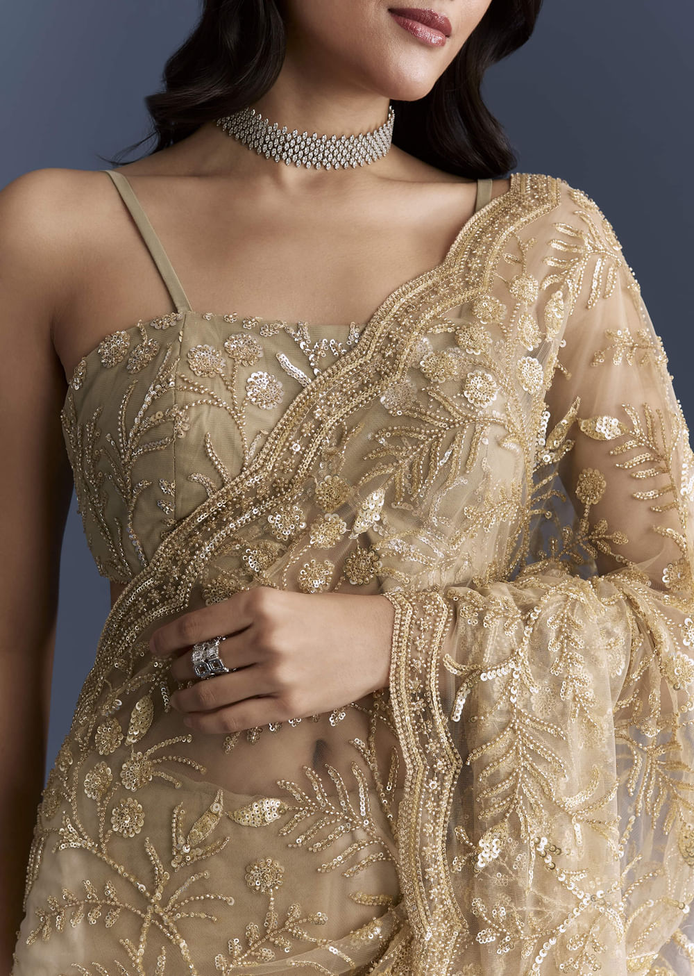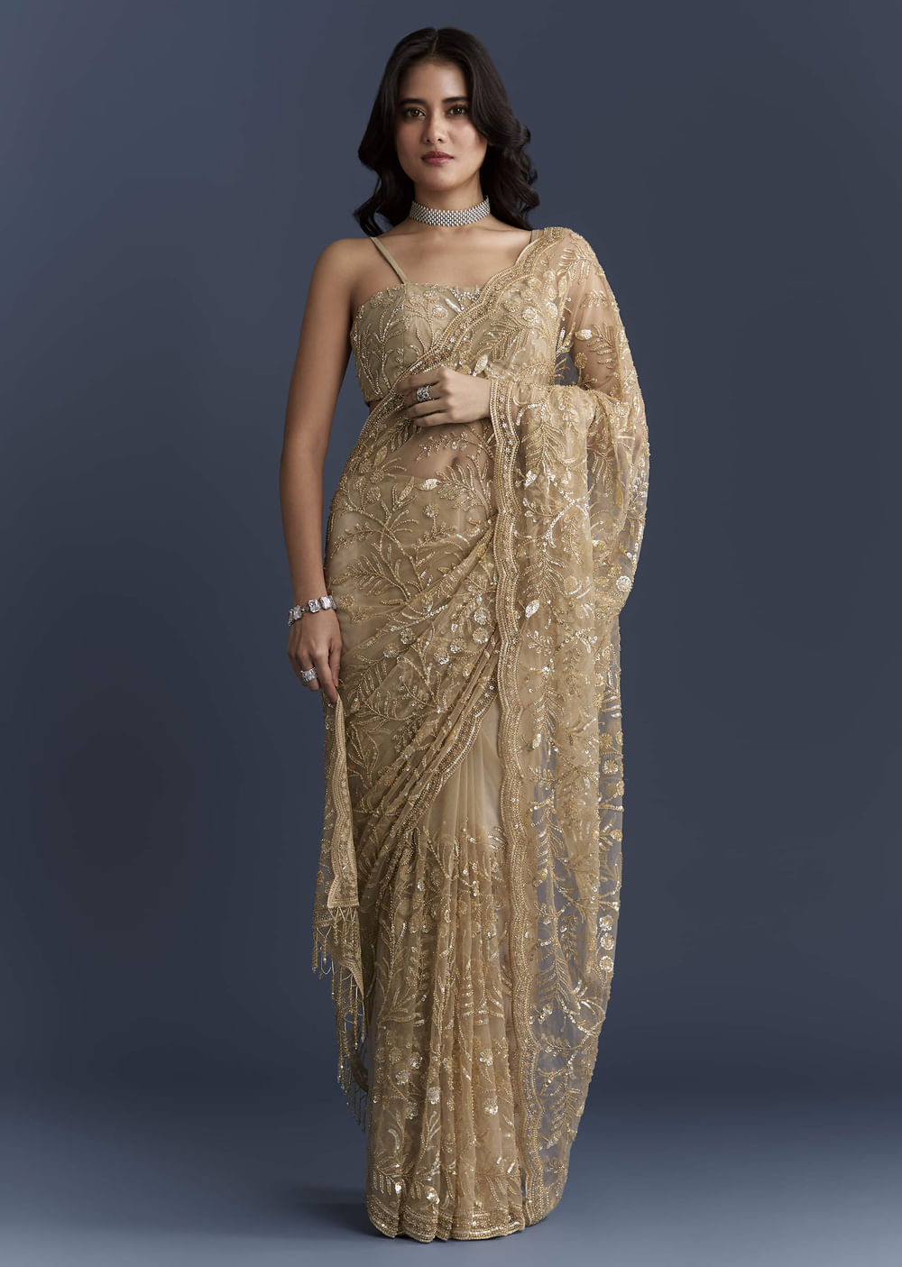 Soft-focus shimmer comes naturally to this gold net saree, catching light while staying airy through long events. Heavy floral sequin embroidery meets a scalloped edge and latkans, with a coordinated embroidered blouse fabric to complete the set. You feel luminous, refined and ready for reception, party and cocktail settings. Awarded as the Most Trusted Brand, we're delivering styles you love, just as promised.