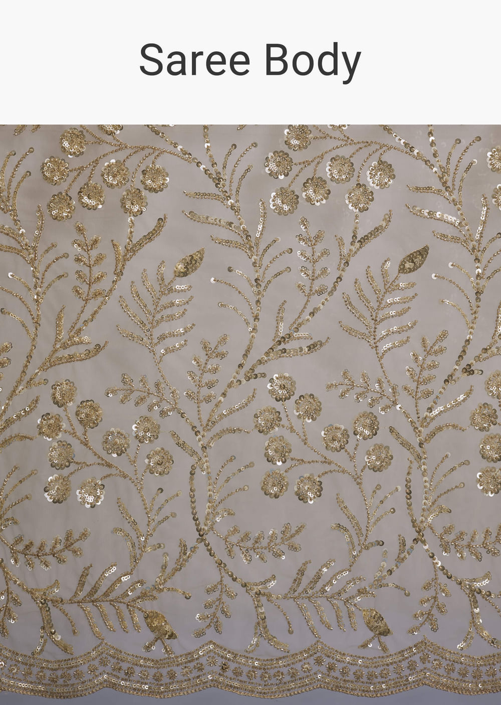 Soft-focus shimmer comes naturally to this gold net saree, catching light while staying airy through long events. Heavy floral sequin embroidery meets a scalloped edge and latkans, with a coordinated... More Product Details