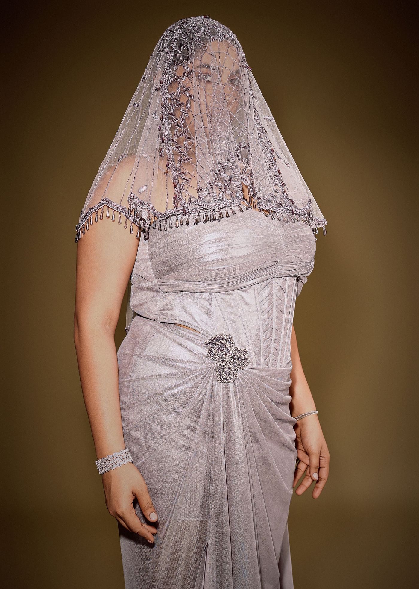 Pair with a sleek bun and crystal danglers. Let the shoulder brooch take center stage.
