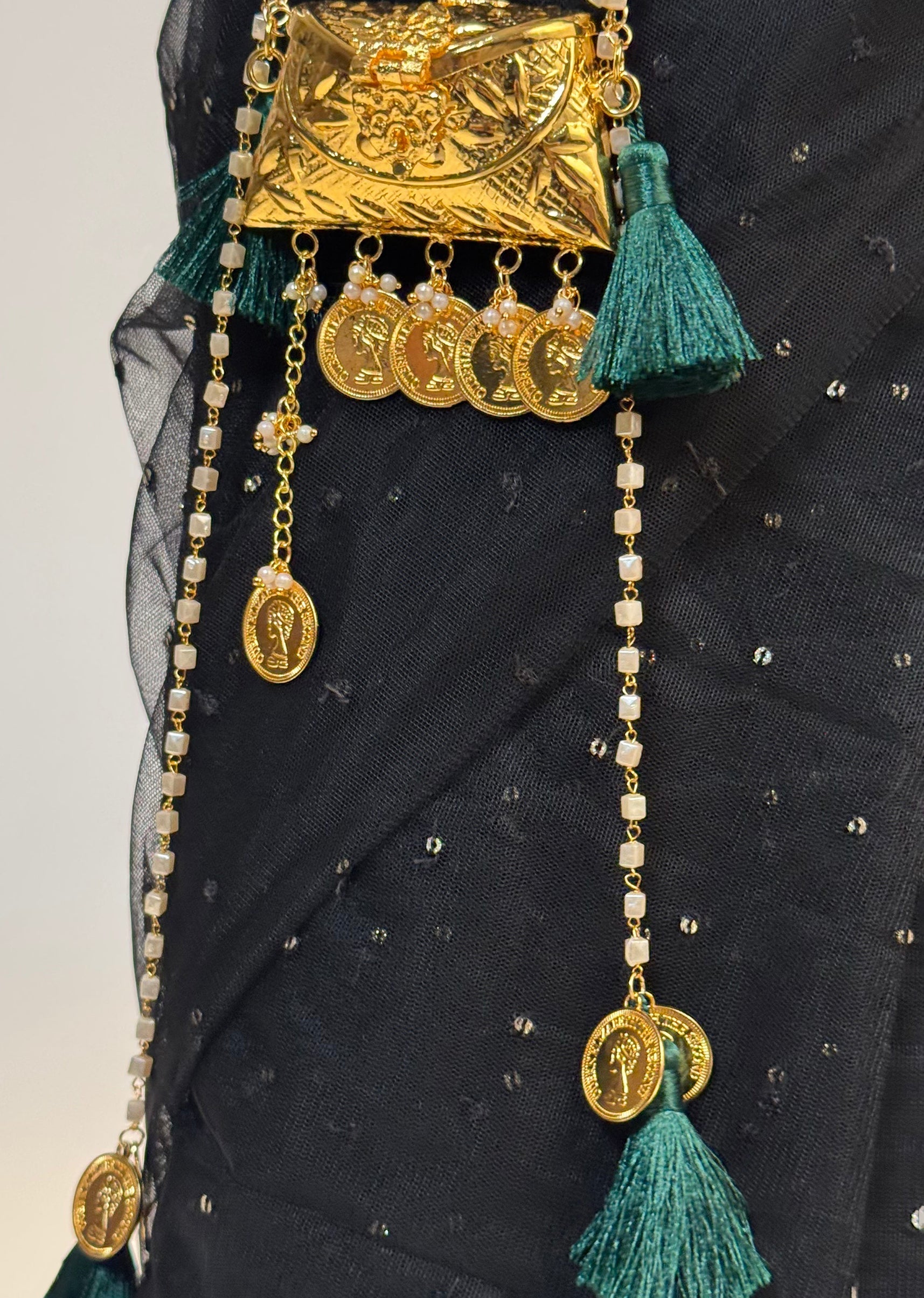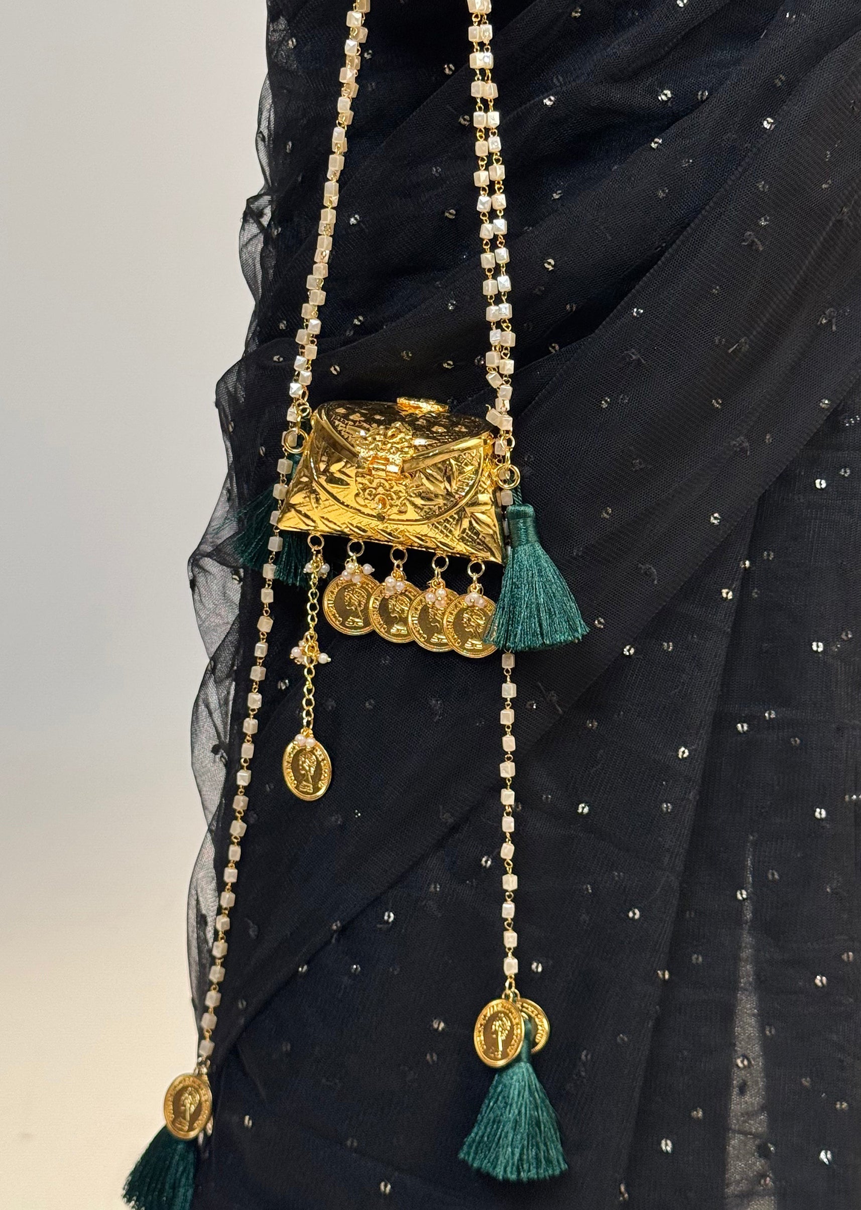 A traditional potli adorned with coin charms, pearl detailing and elegant tassel accents—crafted for refined festive styling. Awarded as the Most Trusted Brand, we're delivering styles you love, just as promised.