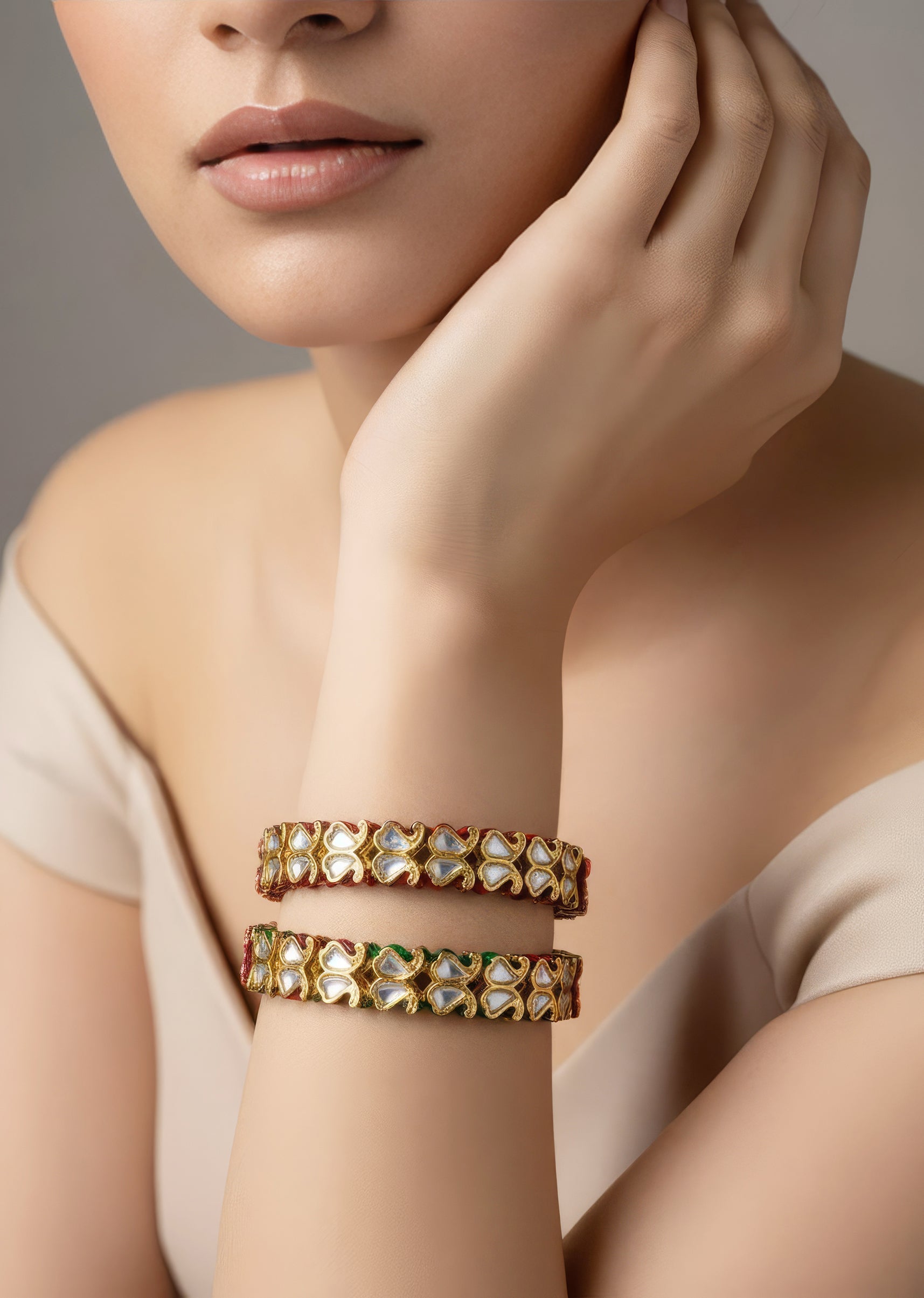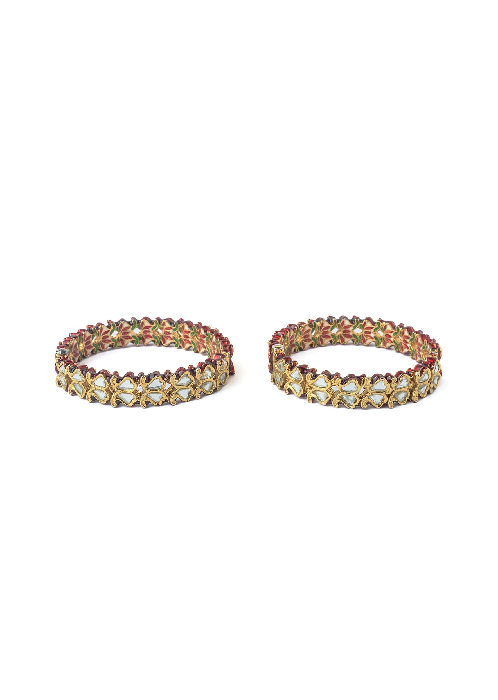 Elegant gold-plated bangles adorned with red and green enamel and white stone inlays. Intricate floral motifs and mirror detailing add a touch of traditional charm, perfect for festive occasions. Product dimensions may vary slightly. Awarded as the Most Trusted Brand, we're delivering styles you love, just as promised.