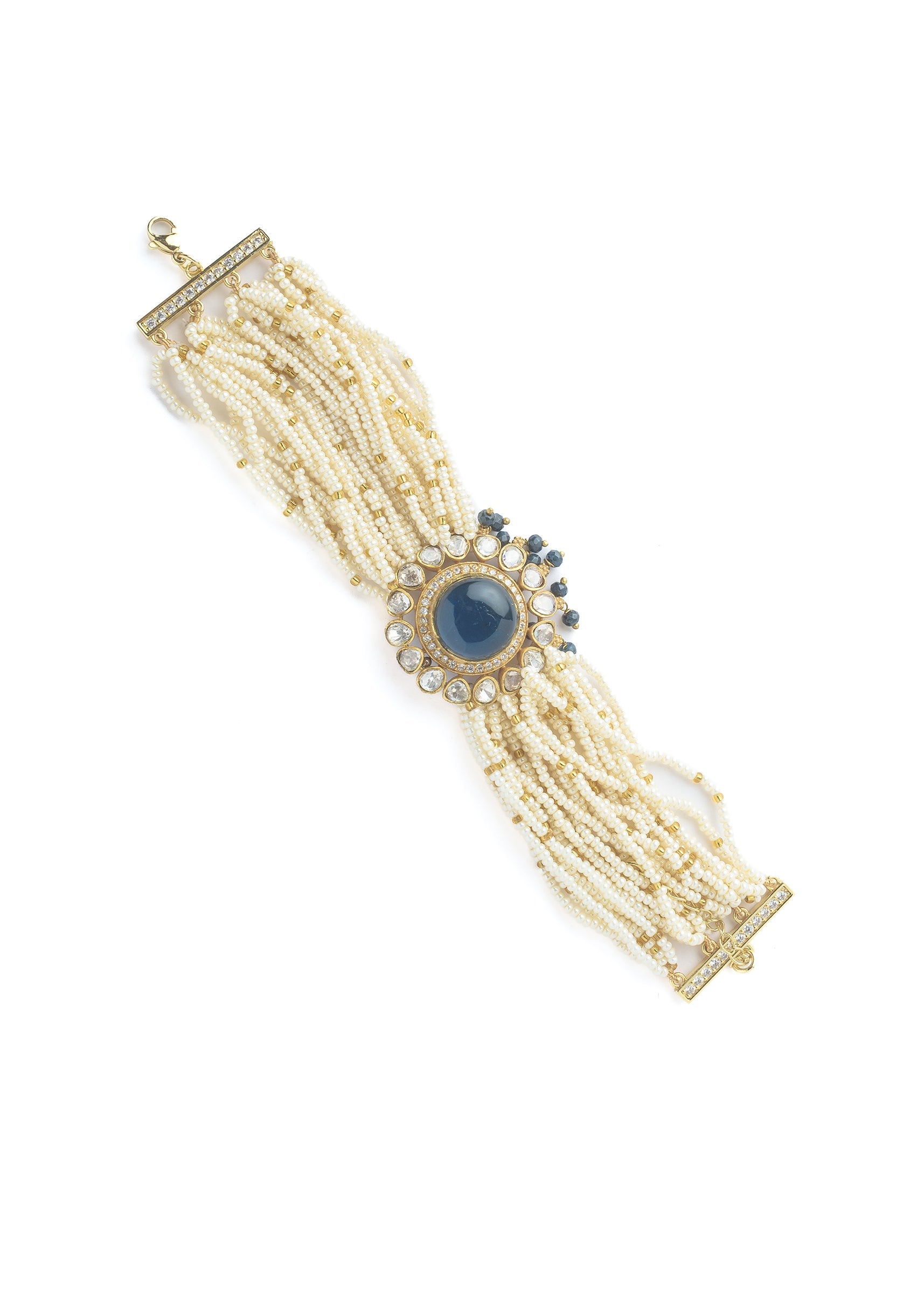 Graceful pearl-beaded bracelet with a striking navy blue stone centerpiece, embellished with kundan accents and gold-tone finish. Ideal for ethnic wear, festive occasions, or traditional ceremonies. Product dimensions may vary slightly. Awarded as the Most Trusted Brand, we're delivering styles you love, just as promised.