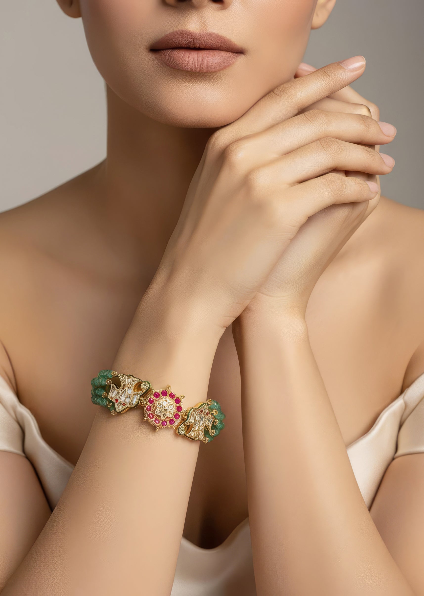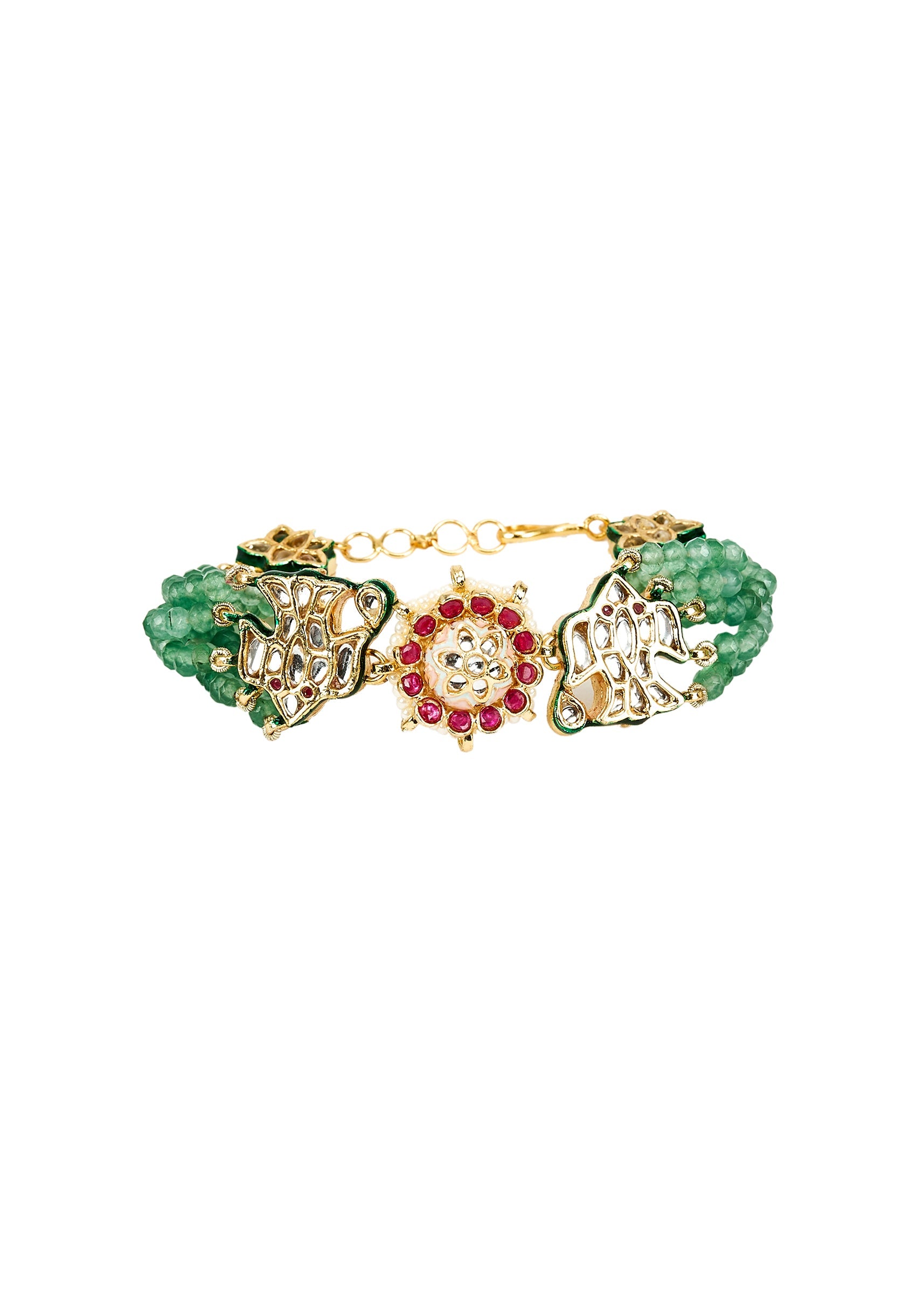Elegant bracelet features intricate gold motifs paired with vibrant green beads & ruby accents. Perfectly complementing traditional attire, it adds a touch of sophistication & charm to your ensemble. Product dimensions may vary slightly. Awarded as the Most Trusted Brand, we're delivering styles you love, just as promised.