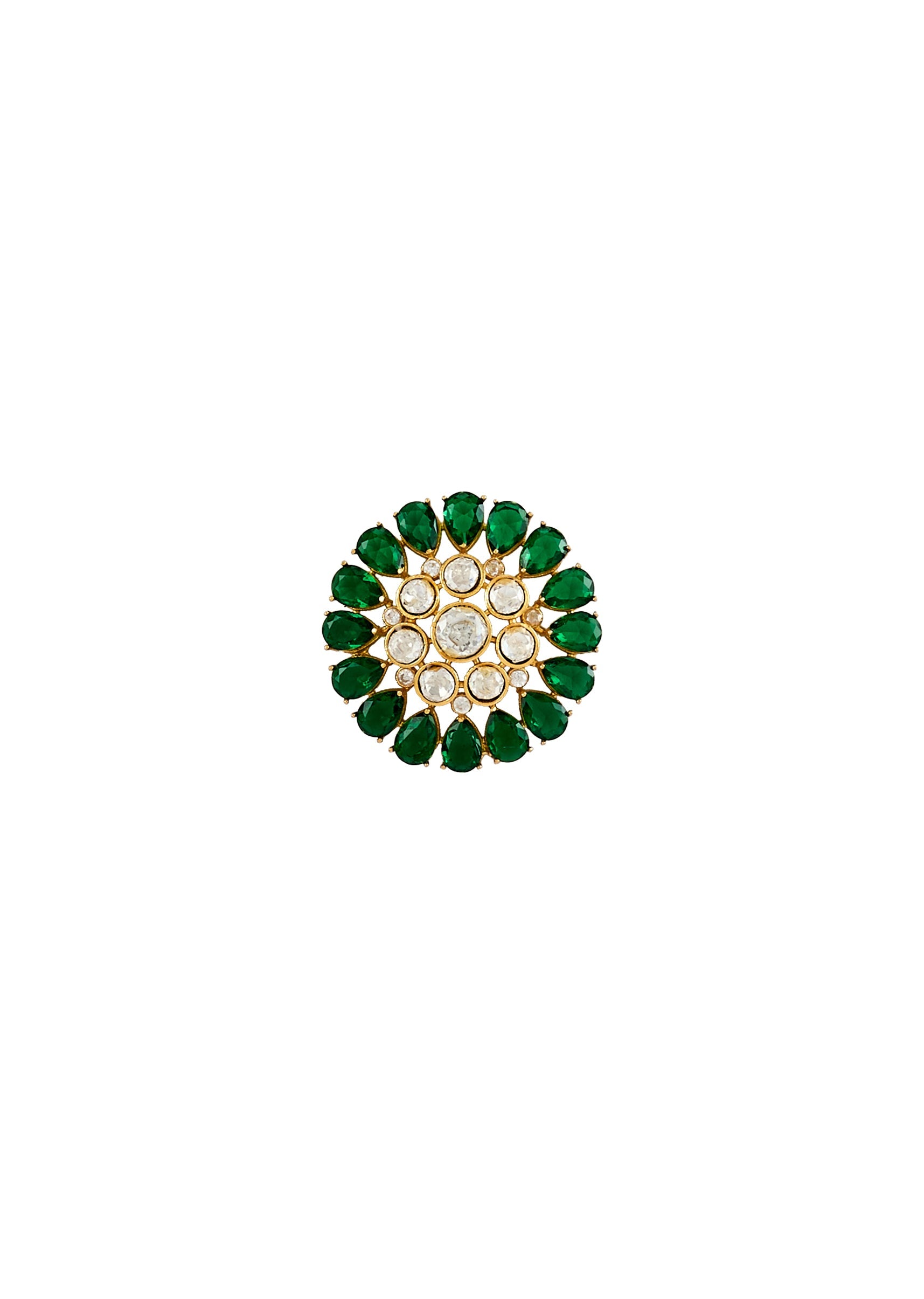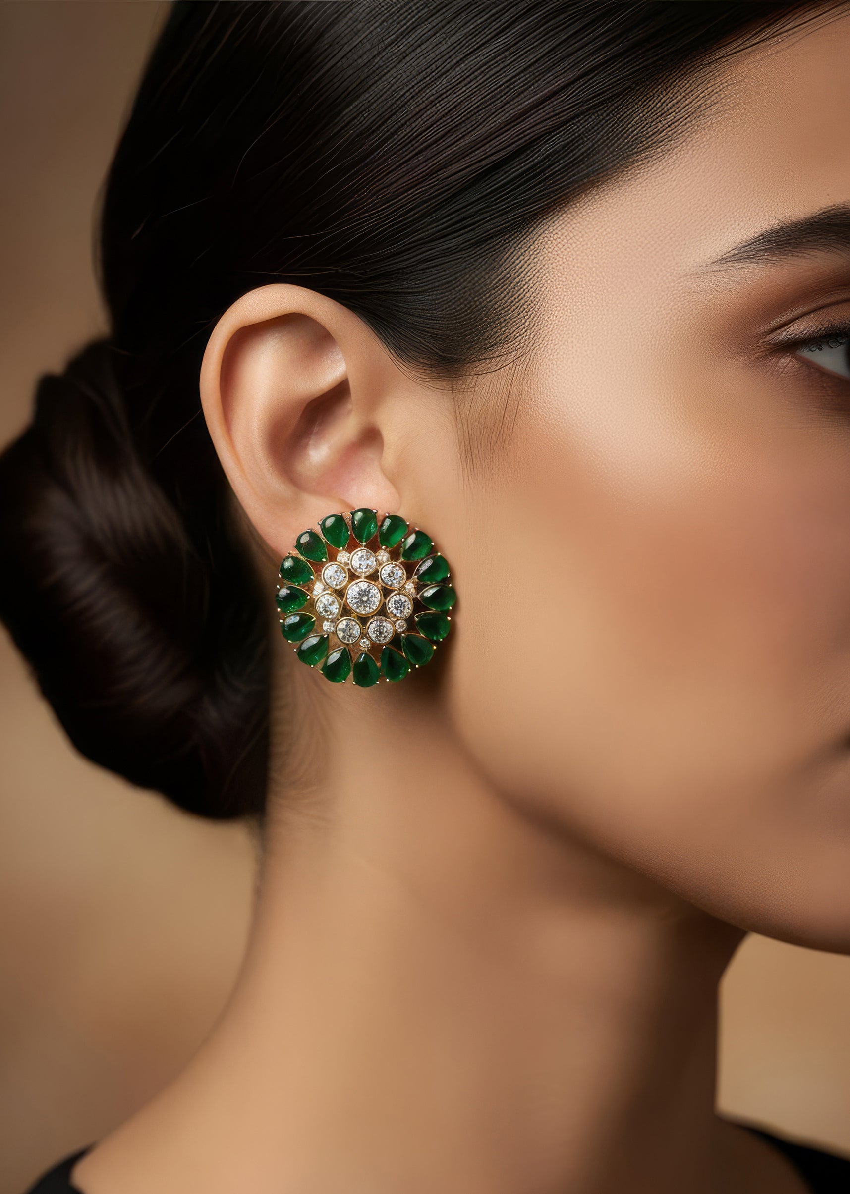 These stunning circular earrings feature a vibrant green gemstone halo and sparkling crystal accents, set in gold-tone metal. Perfect for adding elegance to any occasion or outfit. Product dimensions may... More Product Details