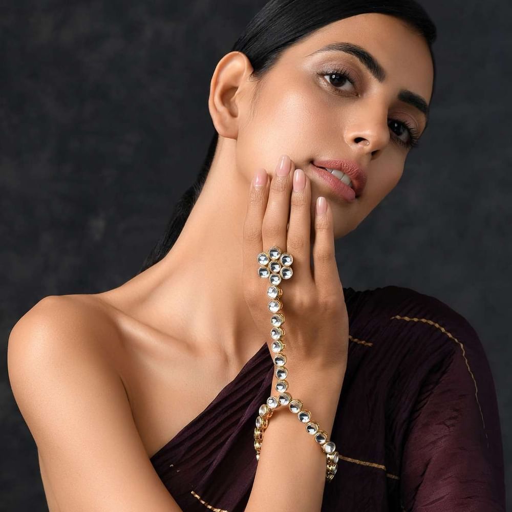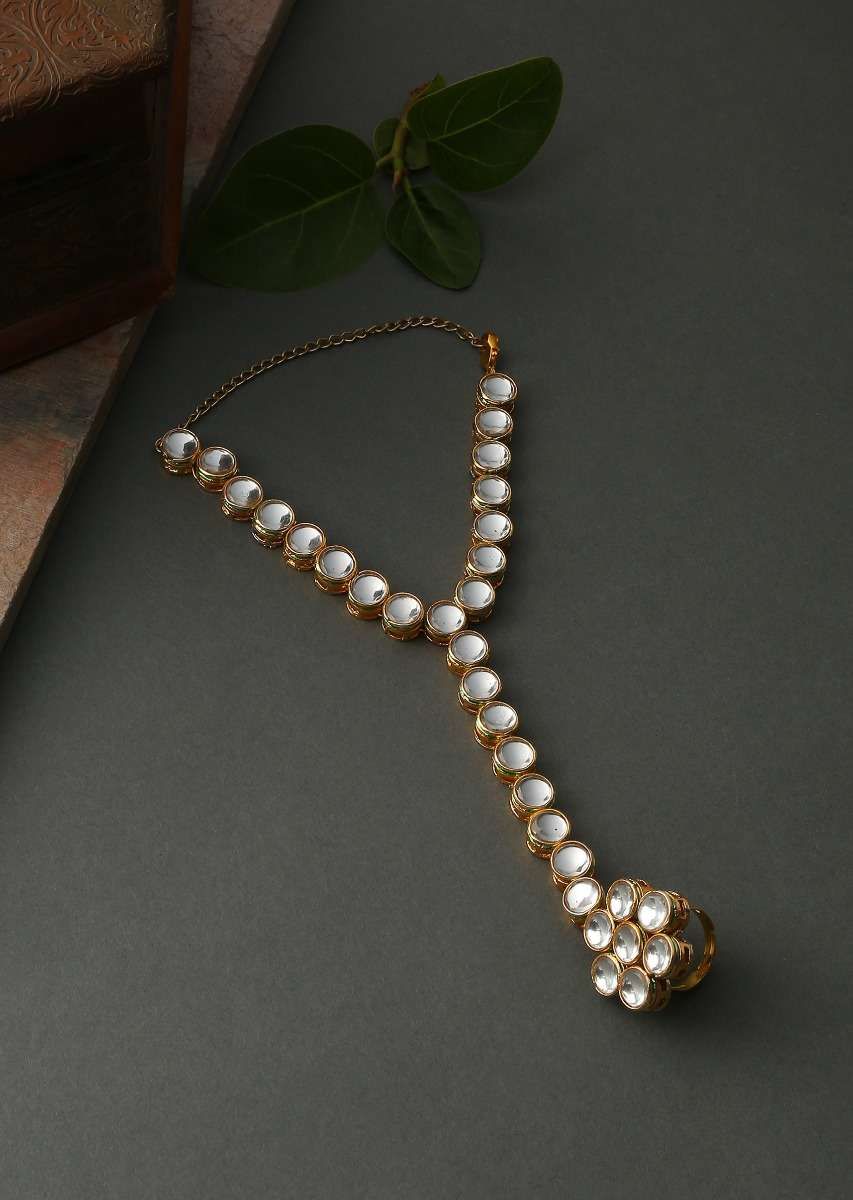 The beautifully handcrafted Adhishree hathphool wraps elegantly around your hand to amp-up your beauty. Based in silver-copper alloy and plated with 22k , this hand harness features precisely cut kundan and shell pearls. Style Tip - This hathphool is a perfect accessory to dress any lookup - Simple Indo western dresses or pastel ethnics. This hand harness is a go-to accessory for chic dressing. Effortless dressing ahoy. Handcrafted in Jammu and Kashmir. Baroque pearls and Natural stones can range from minor aberrations to distinctly ovoid, curved, pinched, or lumpy shapes. Awarded as the Most Trusted Brand, we're delivering styles you love, just as promised.