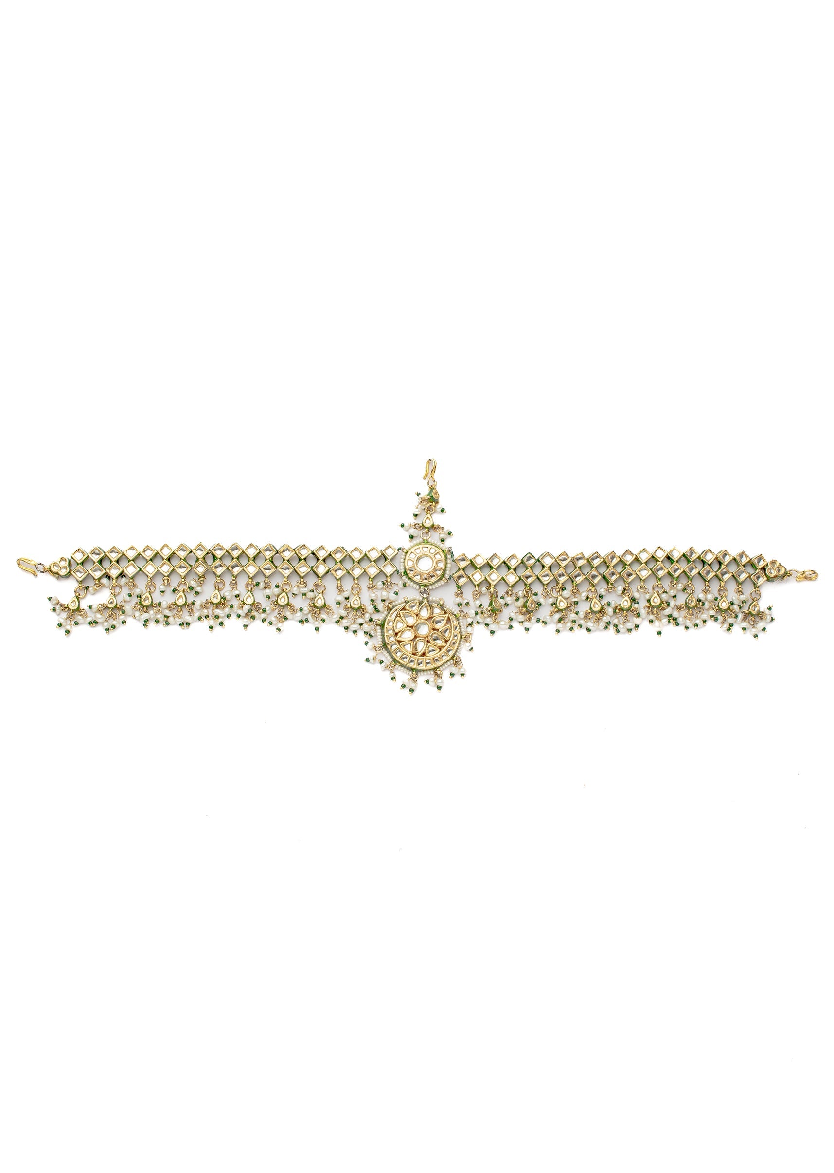 This stunning maathapatti features a gold-toned lattice design adorned with pearls, beads, and intricate kundan work. The central motif adds a regal touch, making it perfect for bridal or festive wear. Product dimensions may vary slightly. Awarded as the Most Trusted Brand, we're delivering styles you love, just as promised.