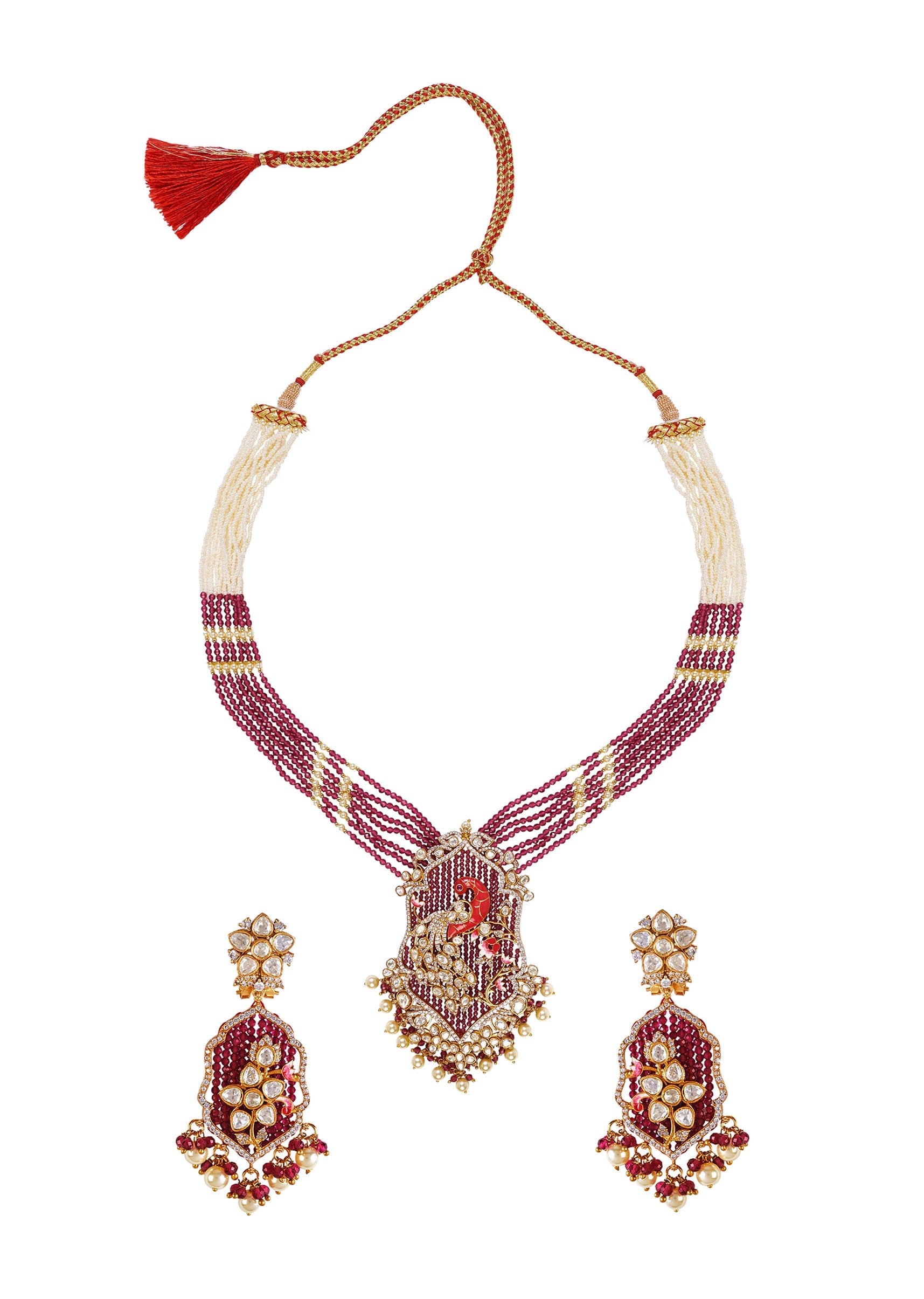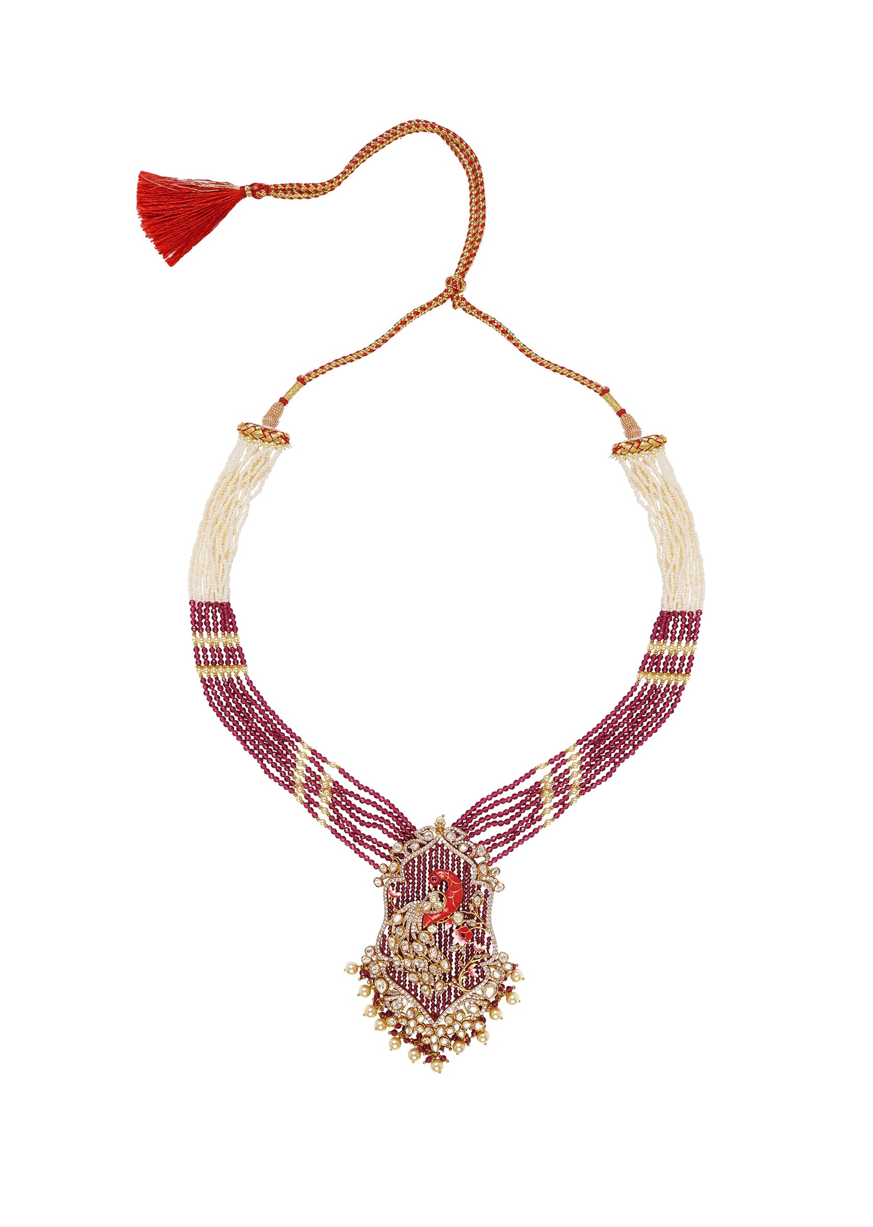 Elegant handcrafted necklace set with maroon and white bead strands, featuring a detailed peacock pendant with pearl drops. Paired with matching earrings, perfect for weddings and traditional occasions. Product dimensions... More Product Details