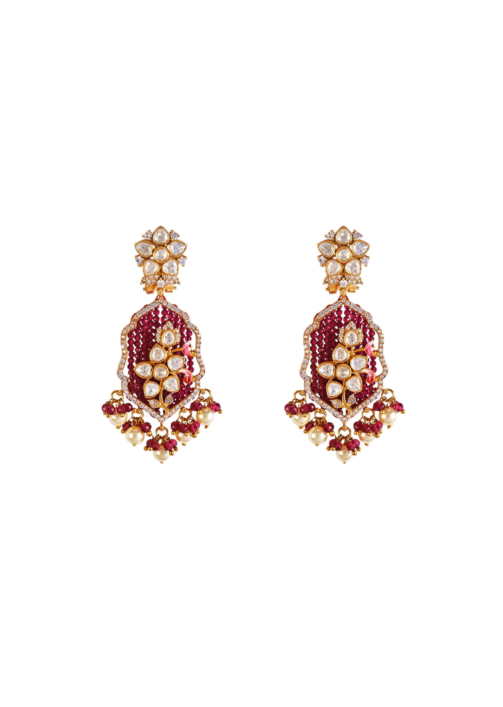 Gold Plated Maroon And White Beads Long Necklace Set With Earrings