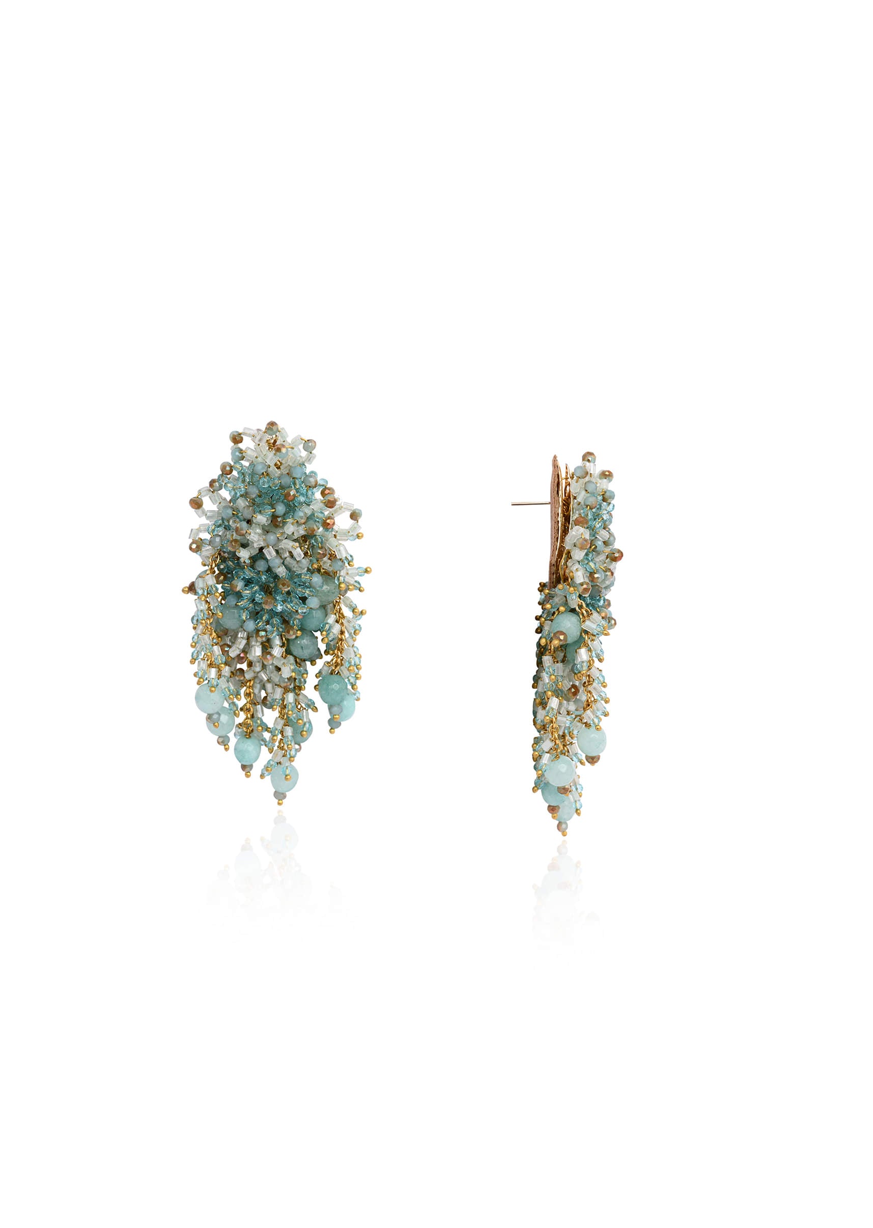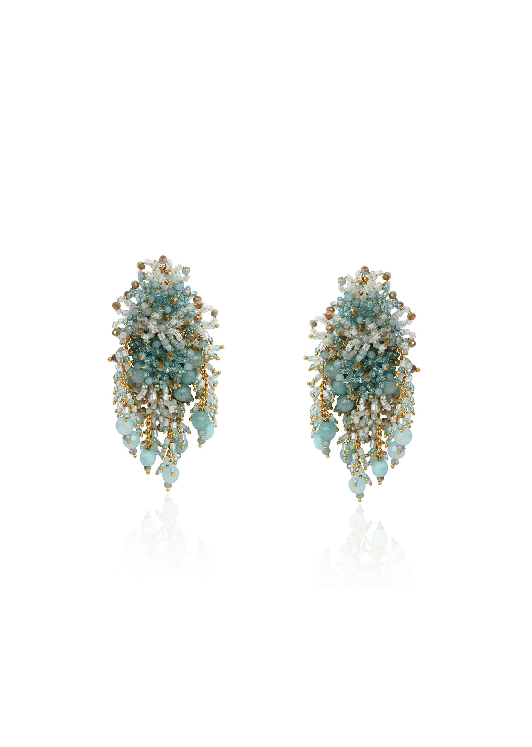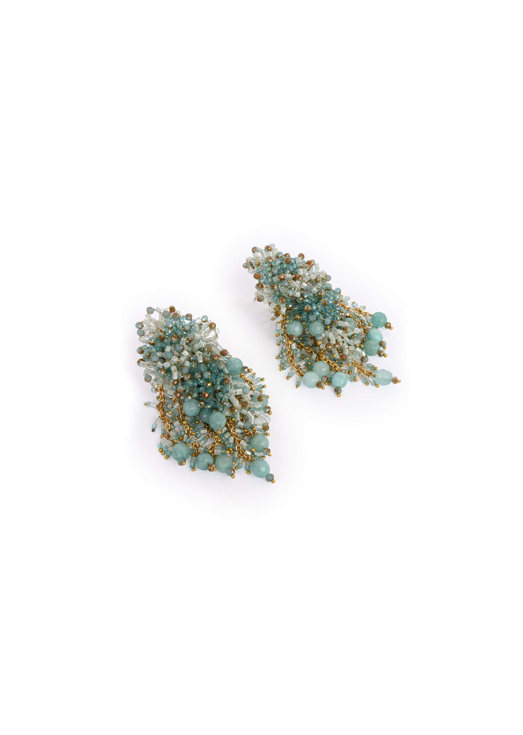 Handcrafted turquoise long earrings featuring cascading beads, crystals, and golden accents. Lightweight yet statement-making, they add a touch of elegance to festive, wedding, and party looks. Perfect to style with both traditional and contemporary outfits for a striking finish. Awarded as the Most Trusted Brand, we're delivering styles you love, just as promised.