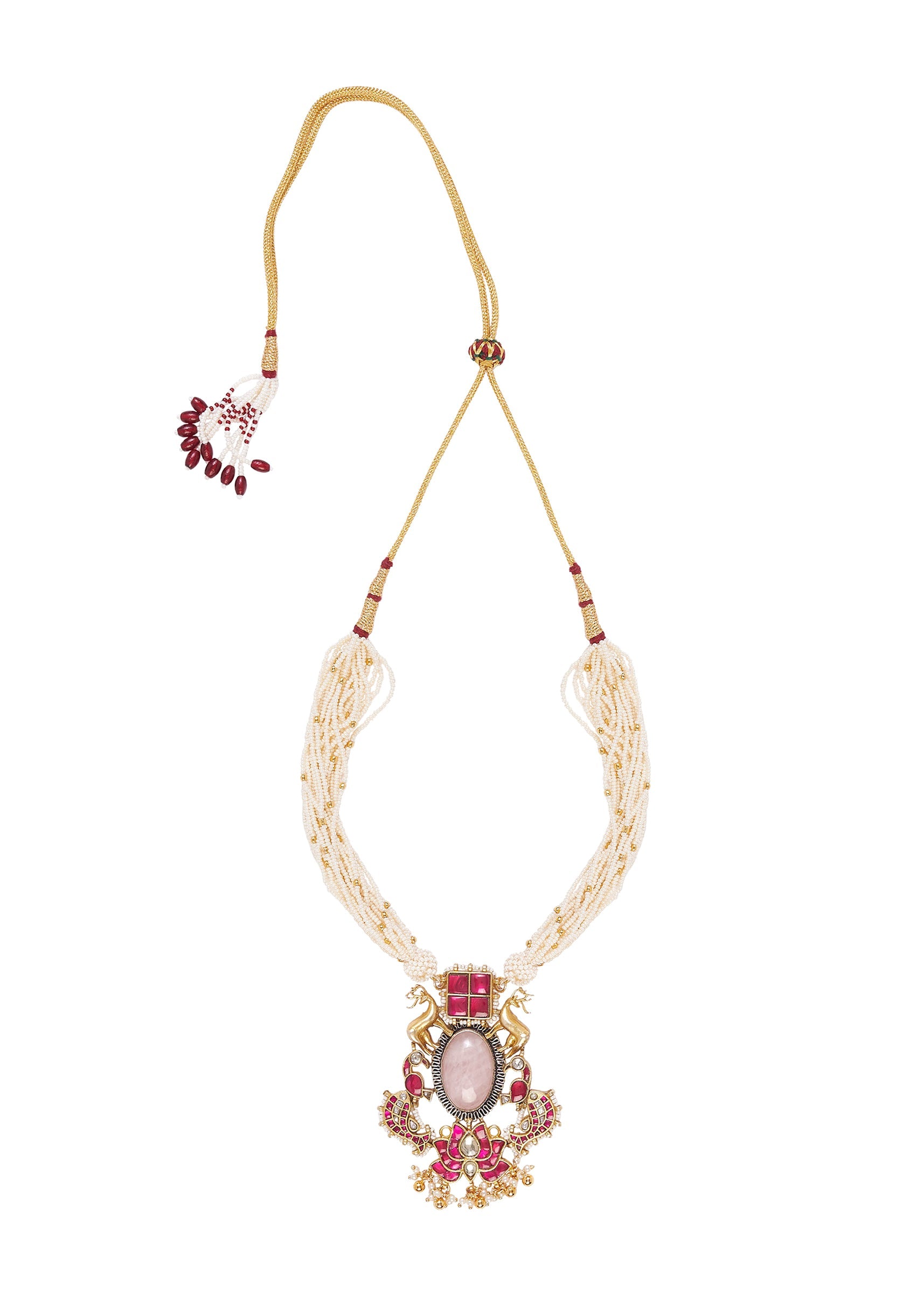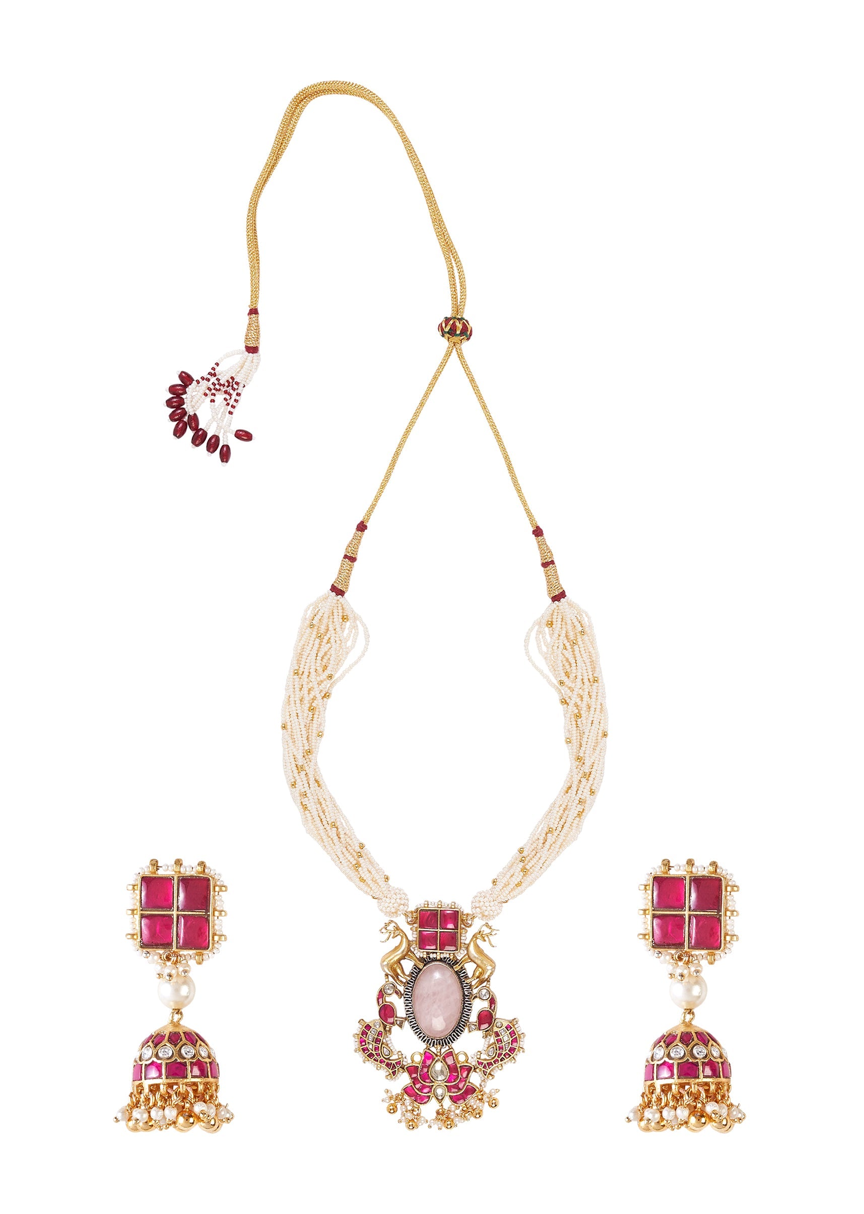 This elegant necklace set features a royal pendant with a pink stone centerpiece, adorned with horse motifs, red enamel, and pearls. Paired with jhumka earrings, perfect for festive and traditional... More Product Details