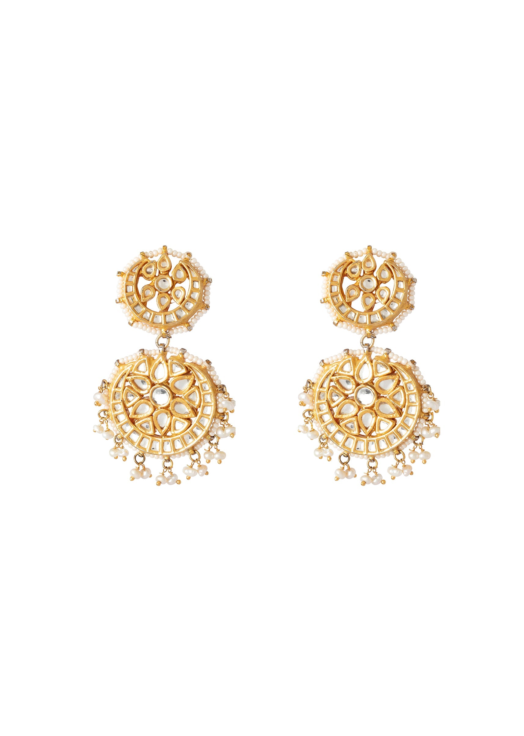 Gold Plated White Kundan Polki Double Drop Earrings