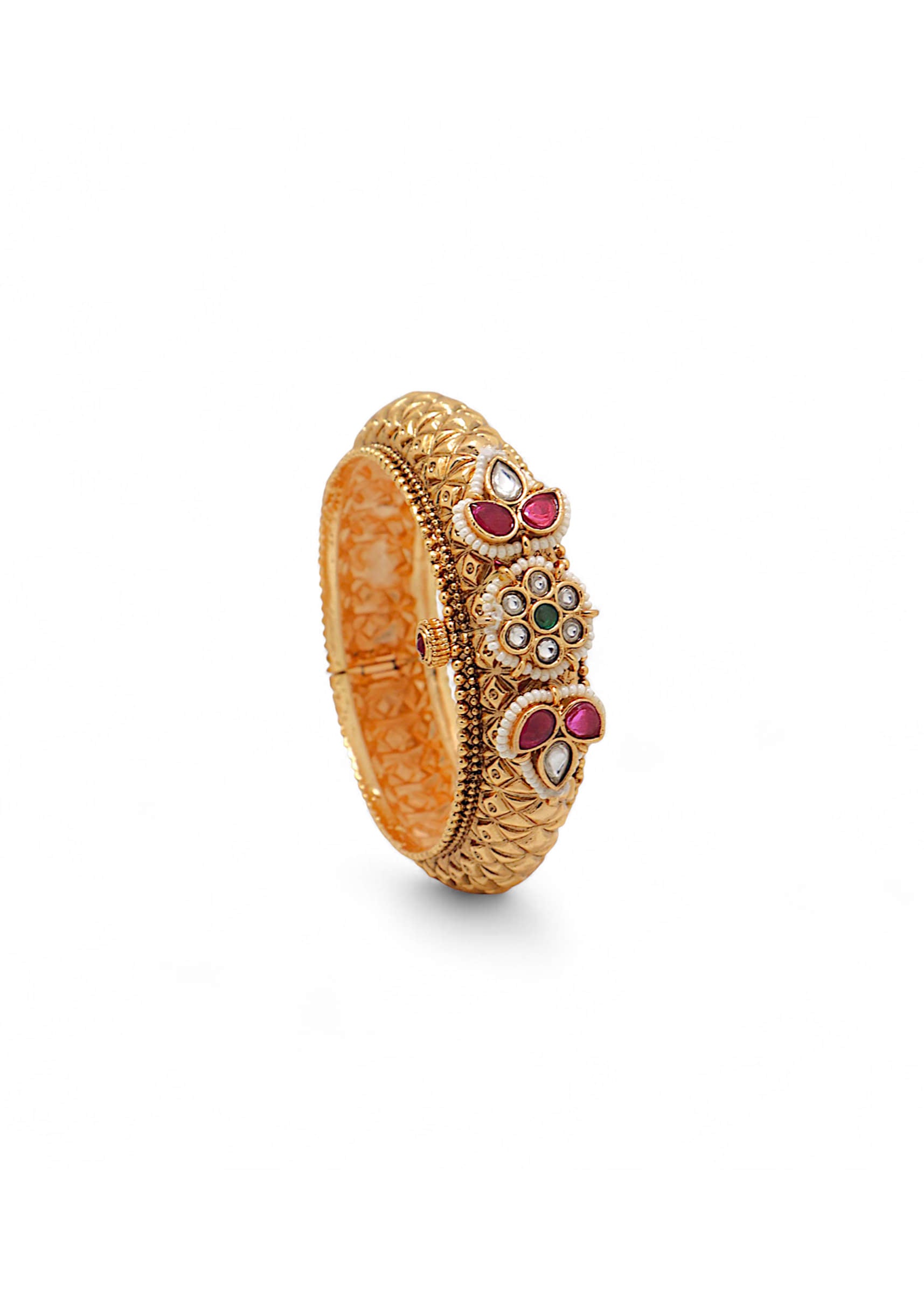 A gold Rajwadi kundan bangle featuring intricate traditional motifs and exquisite stonework, exuding royal elegance. Perfect for elevating bridal, festive, or ethnic ensembles with a luxurious touch.