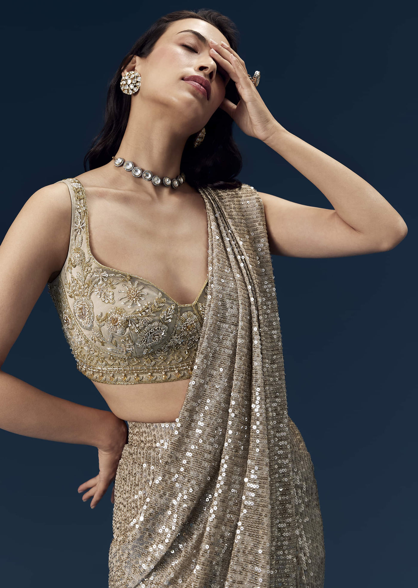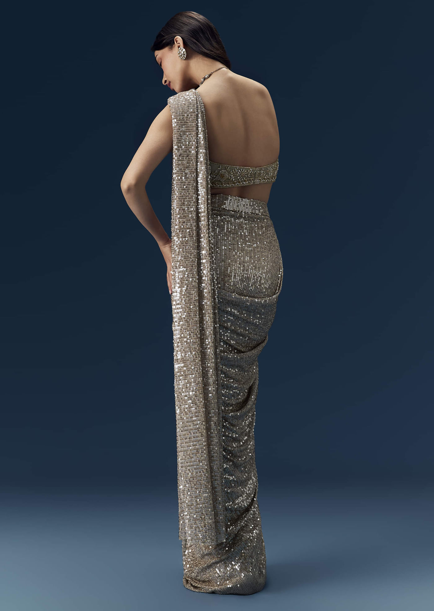 Gold Ready Pleated Sequin Net Saree with Blouse