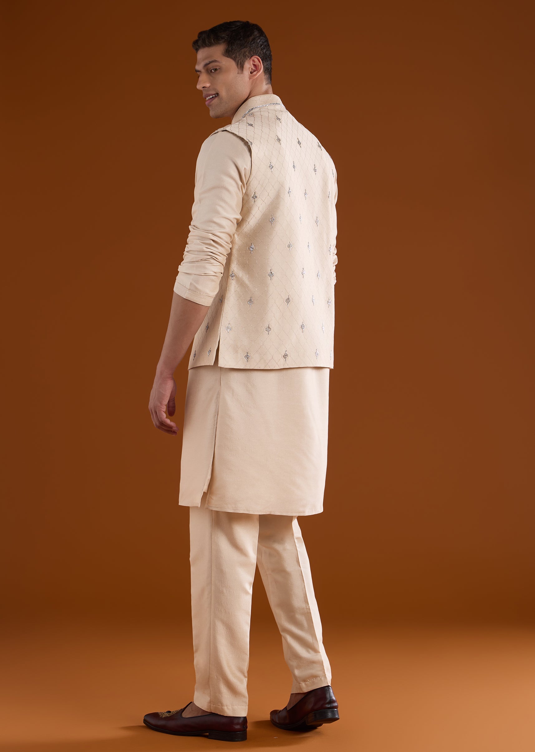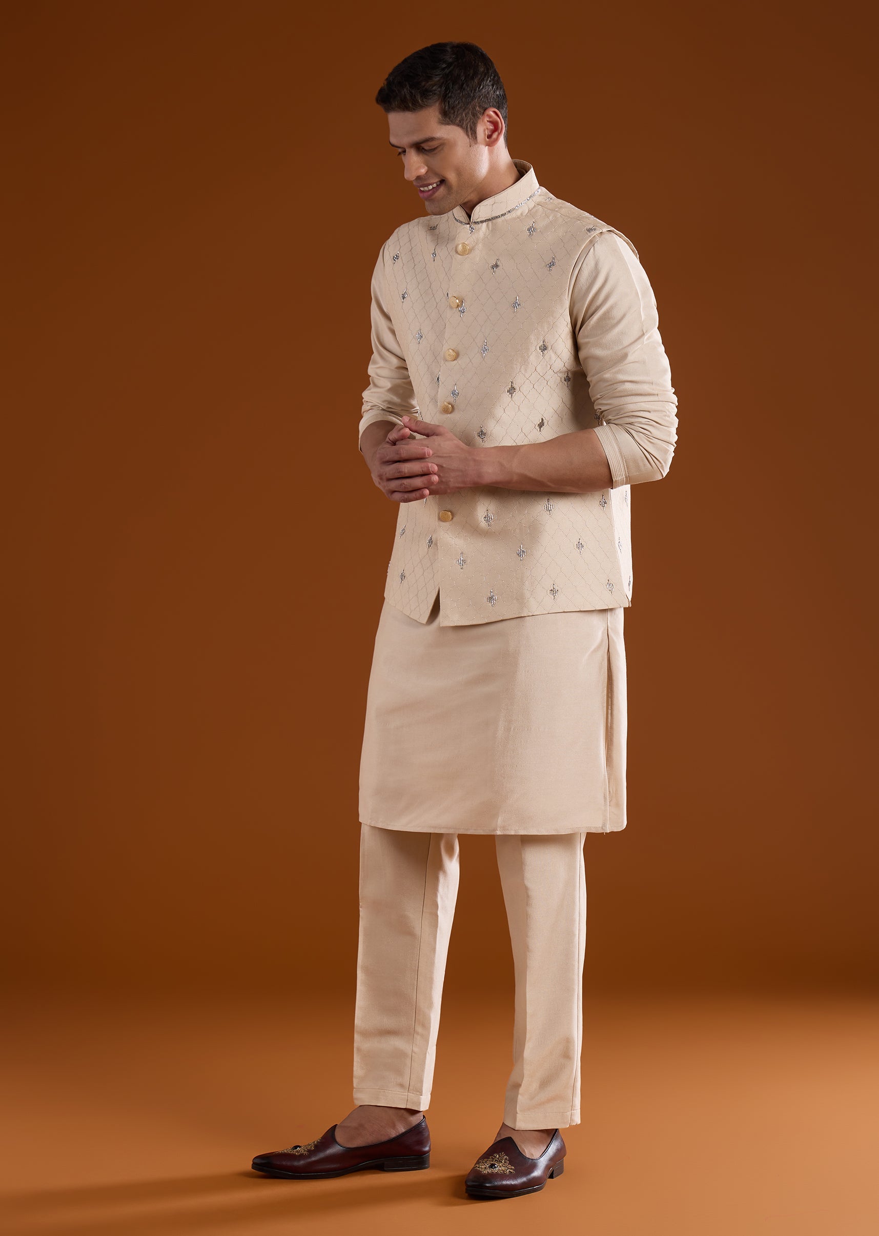 Fit Tips:Ensure the jacket sits comfortably on the shoulders with ease through the arms, and the kurta drapes smoothly for long hours of wear during festivities.