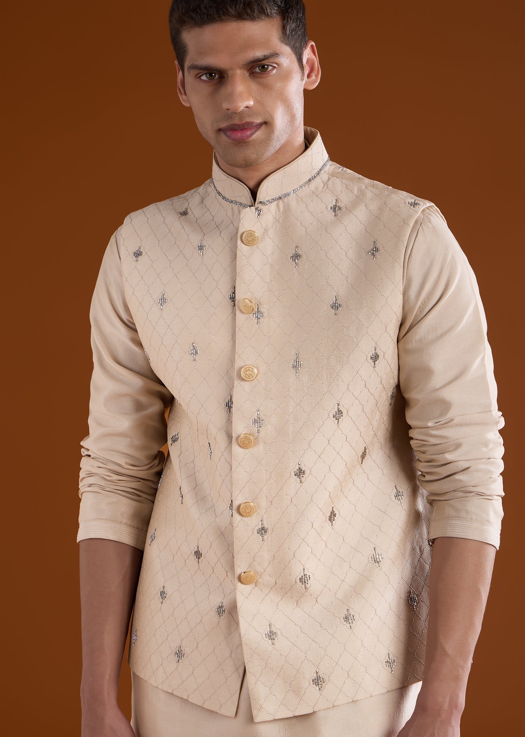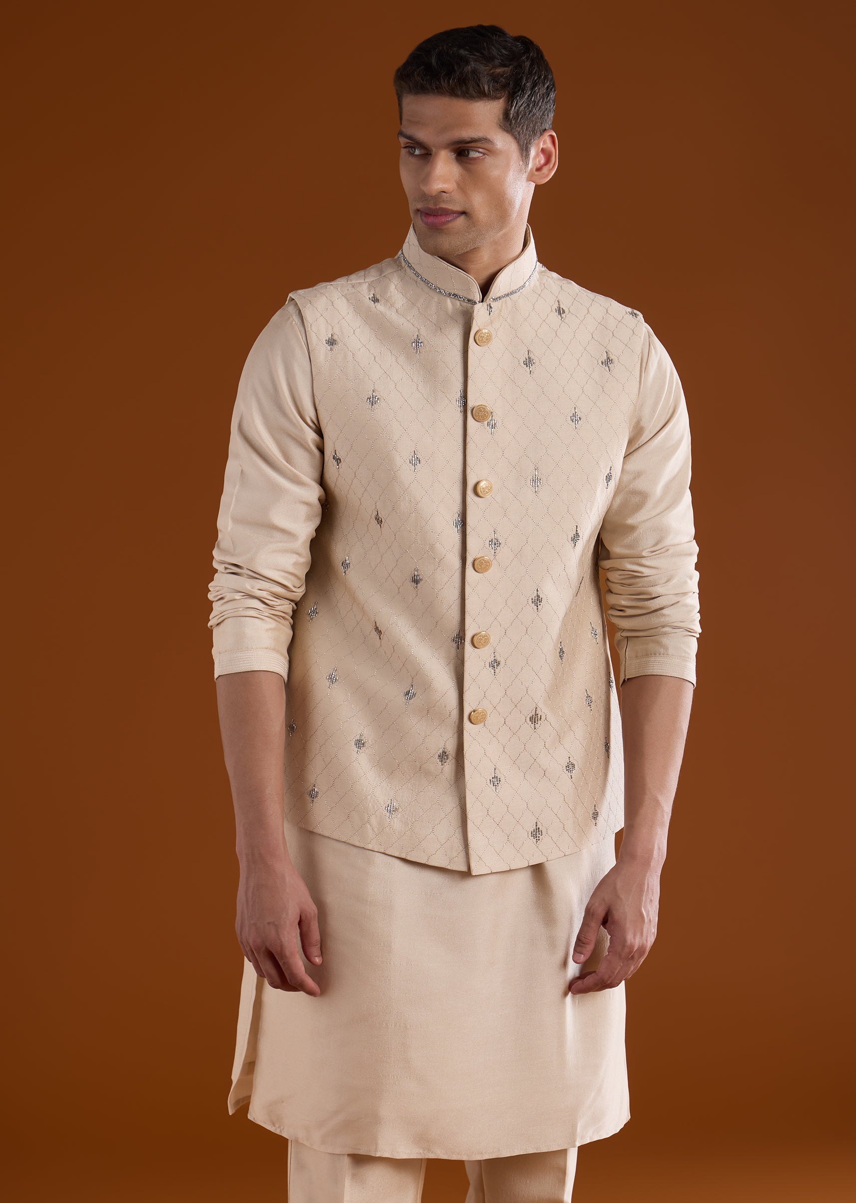Gold Silk Mens Kurta Jacket Set With Thread Metal And Bead Work