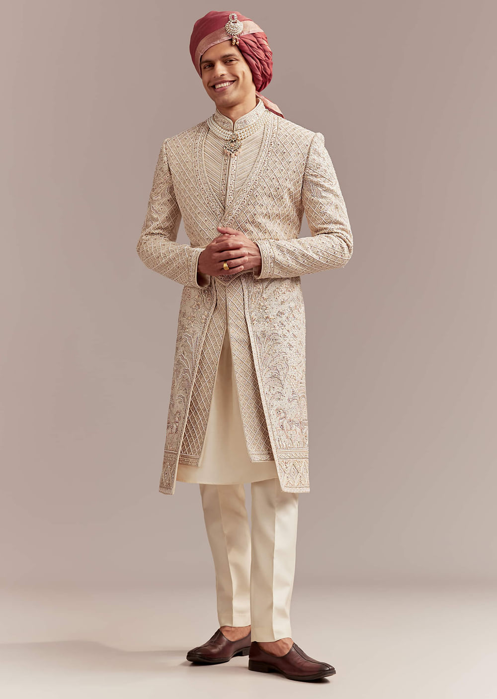 Fit Tips:The sherwani should fit close at the shoulders and flare gracefully below, giving freedom of movement with every step.