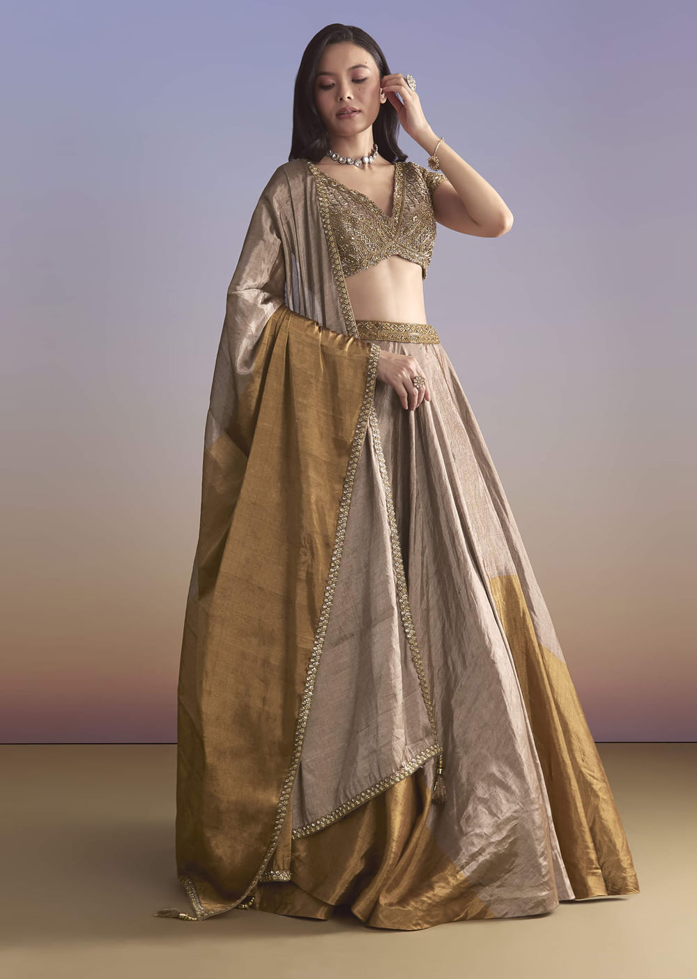 Evening lights love a mellow glow, and this gold tissue bridesmaid lehenga brings a refined shine and a two-tone dupatta. Zardosi on the choli adds rich detail, while a neat... More Product Details