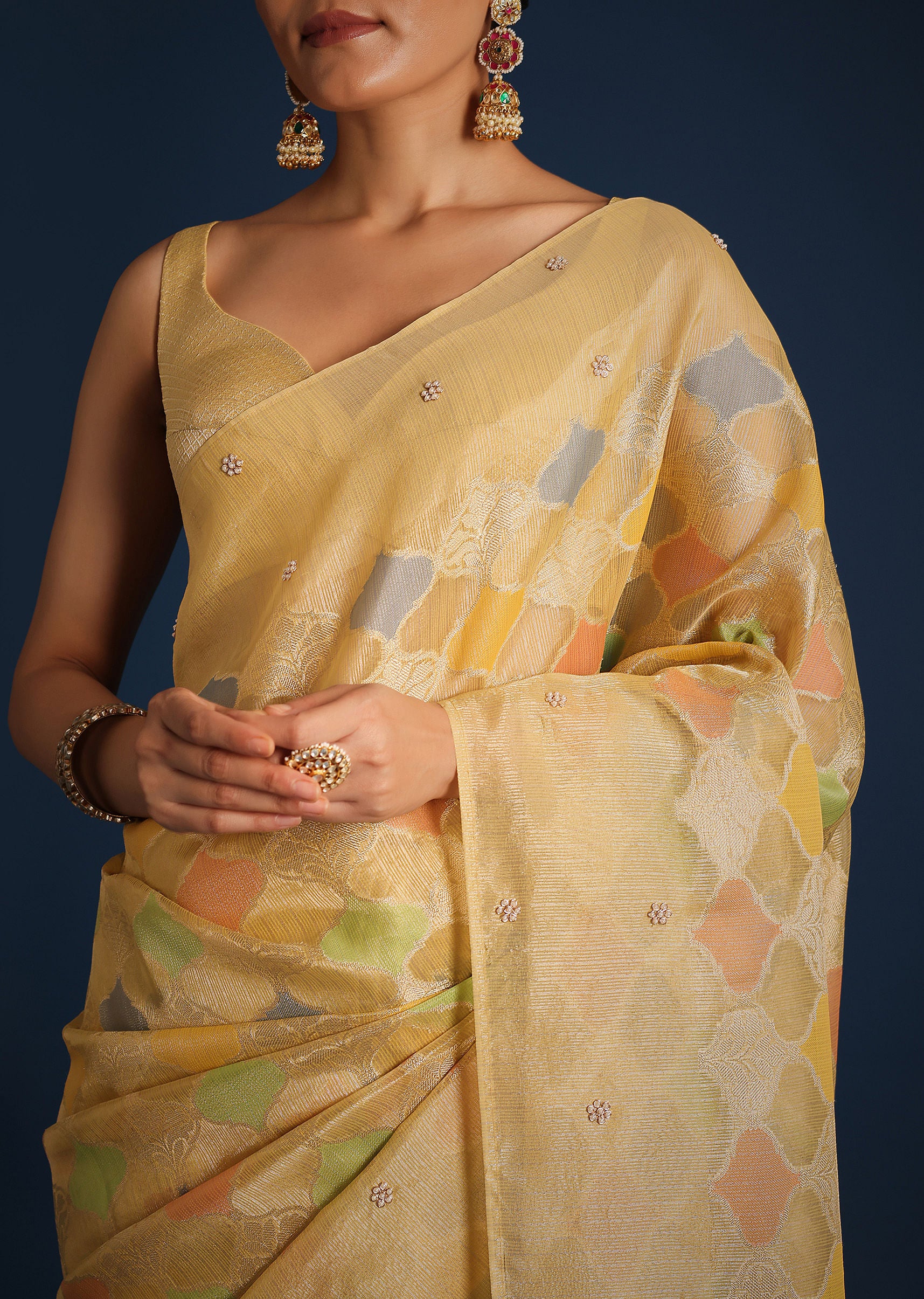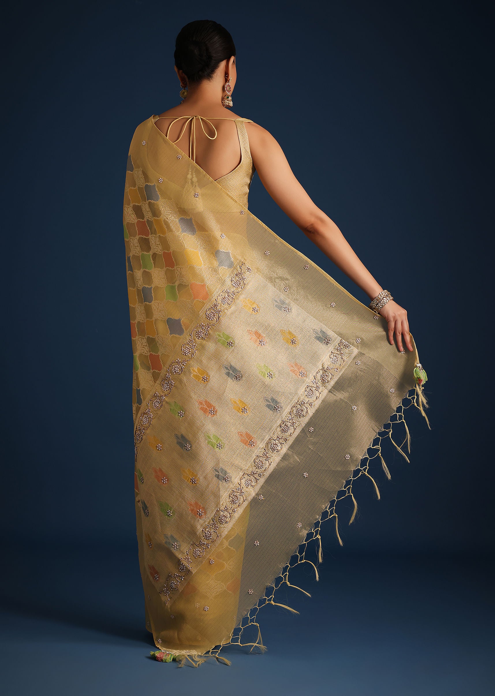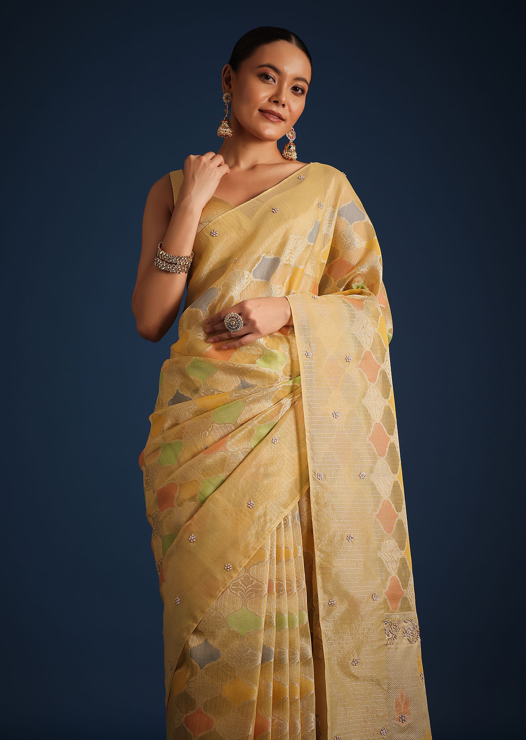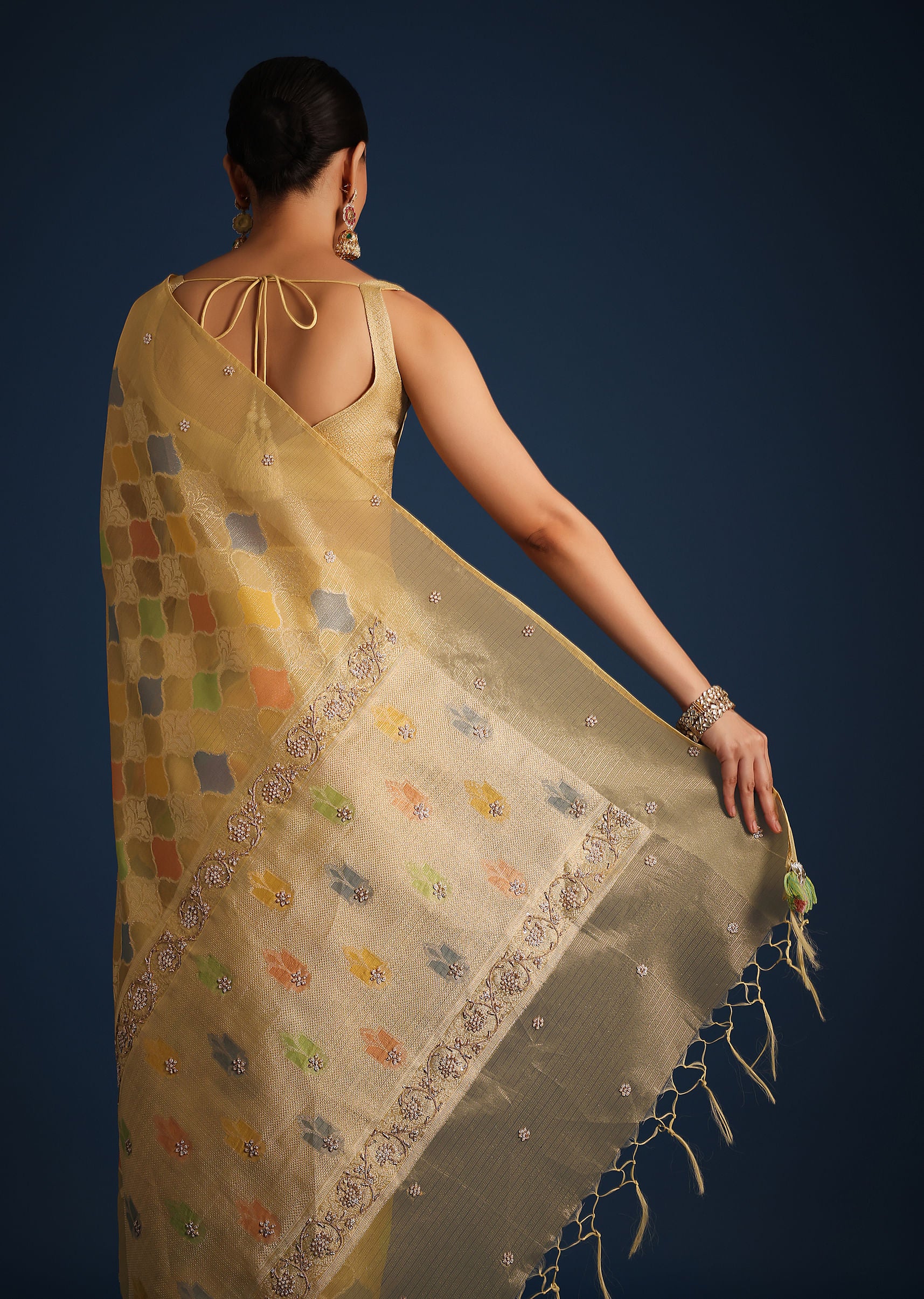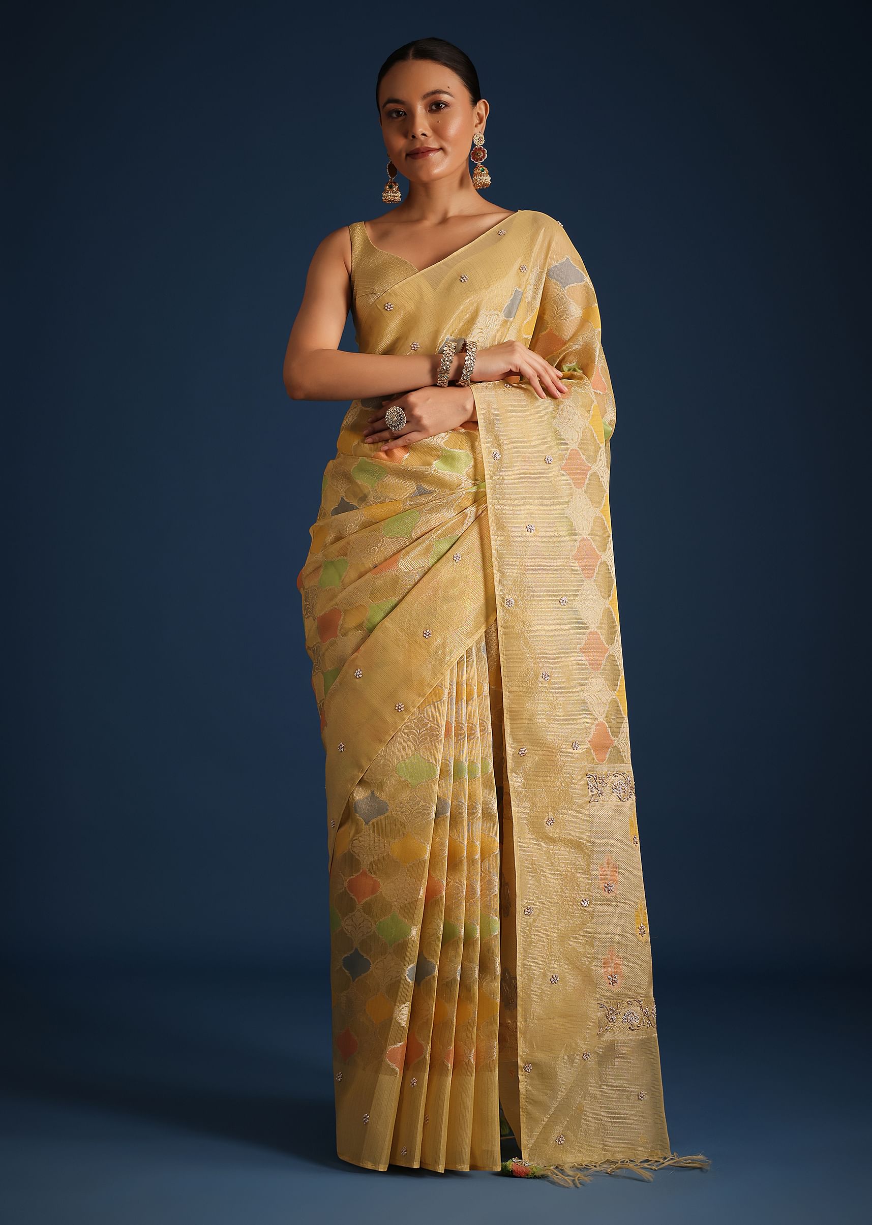 A design that incorporate new-age aesthetics with timeless style is our vibrant gold saree. Crafted from rich tissue chanderi, it features traditional rangkart weaving. Decked with multi-colored motifs, and beautiful tassels on the border, this regal drape is perfect for family gatherings, wedding receptions, or any special occasion where you want to make a lasting impression. Awarded as the Most Trusted Brand, we're delivering styles you love, just as promised.