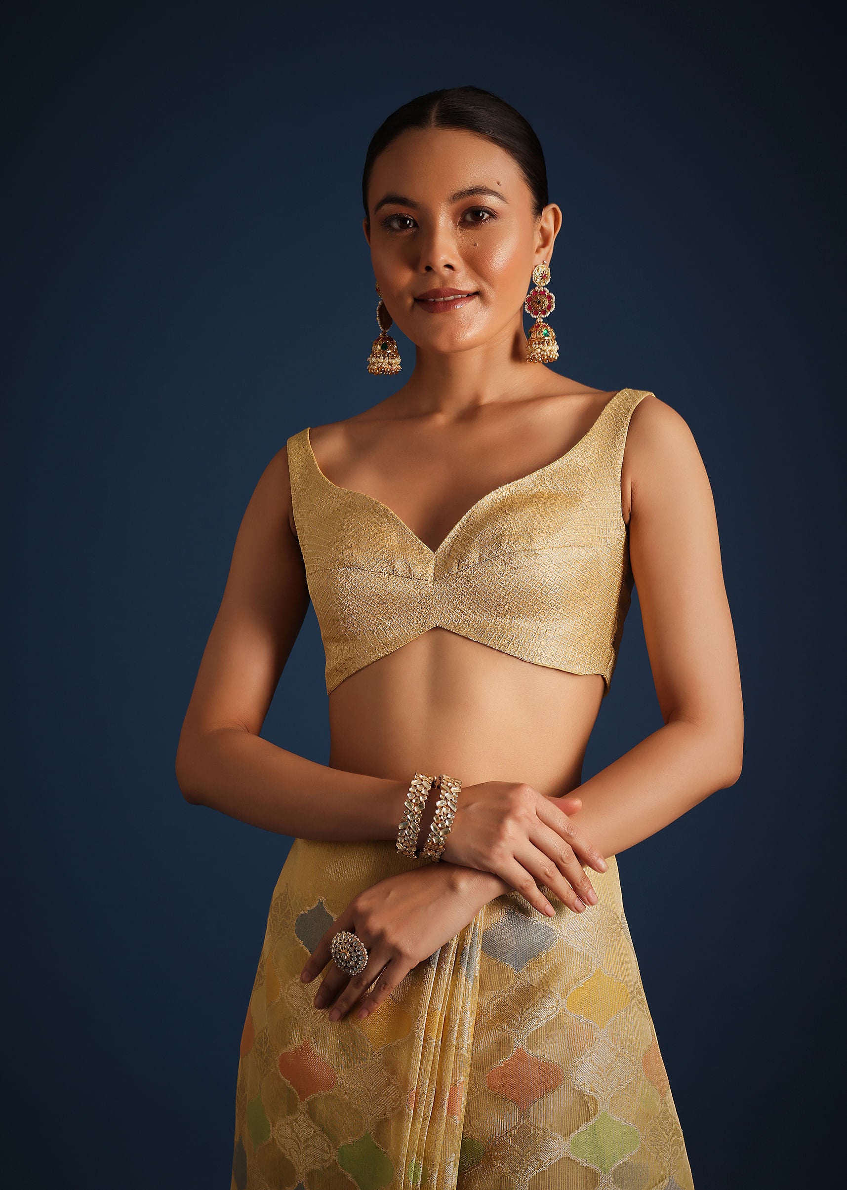 A design that incorporate new-age aesthetics with timeless style is our vibrant gold saree. Crafted from rich tissue chanderi, it features traditional rangkart weaving. Decked with multi-colored motifs, and beautiful... More Product Details