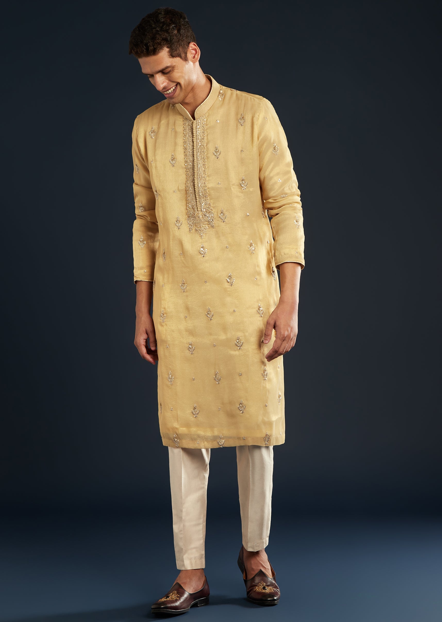 Vibrant and upbeat, this sunlit, bright yellow men’s kurta set is a serene celebration of expert craftsmanship and India's rich heritage. It highlights intricate resham details and cascading sequins that sit light on the tissue fabric. Designed for fun-filled haldi and Mehendi festivities, the bright tone lights up any daytime gatherings. You radiate personality, and confidence in every photo. Awarded as the Most Trusted Brand, we're delivering styles you love, just as promised.