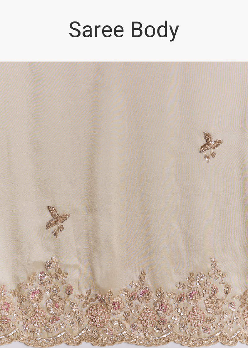 An opulent gold tissue saree detailed with cut dana and sequin embroidery. The scallop heavy border adds richness, paired with a matching embroidered unstitched blouse fabric. Awarded as the Most... More Product Details