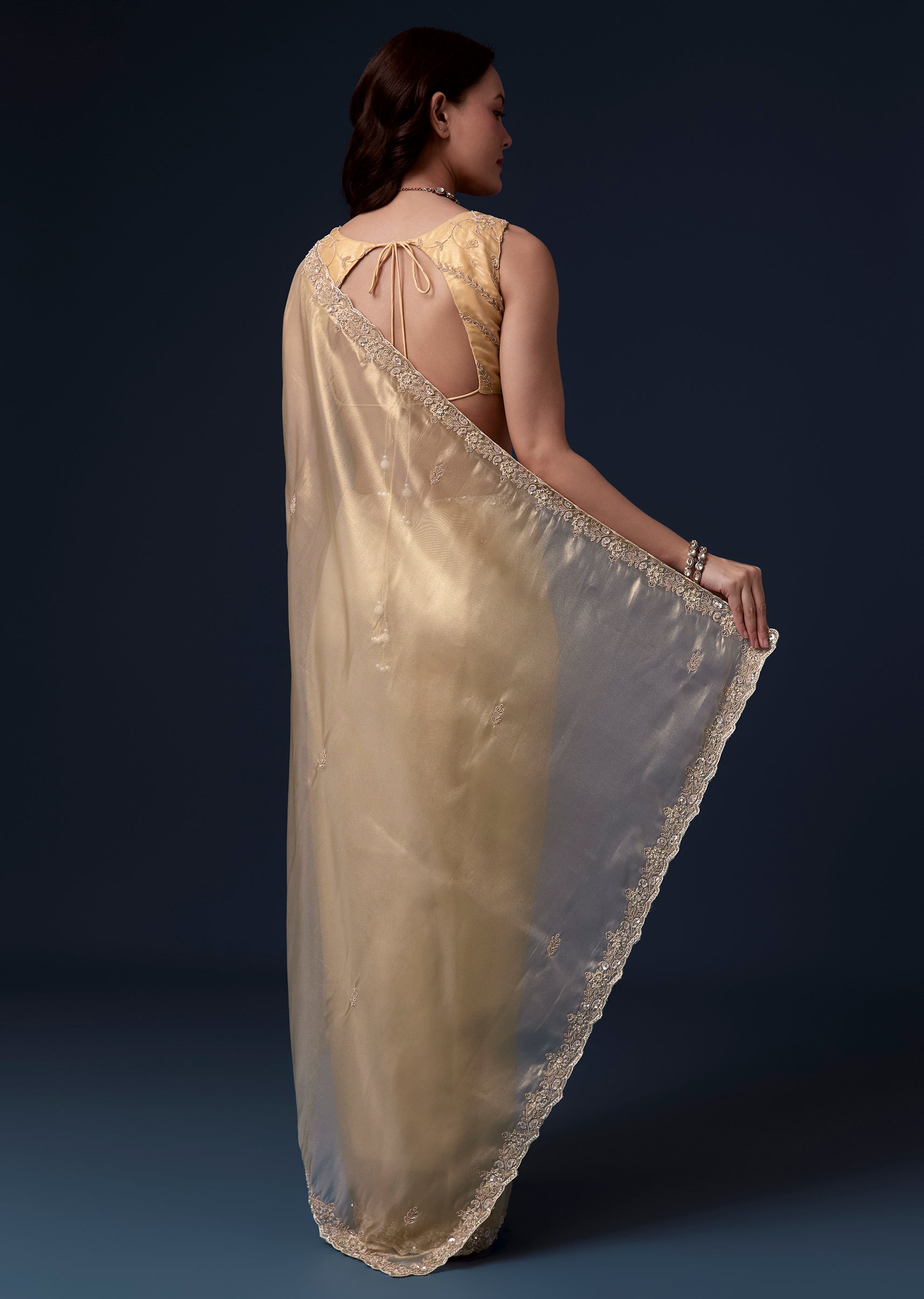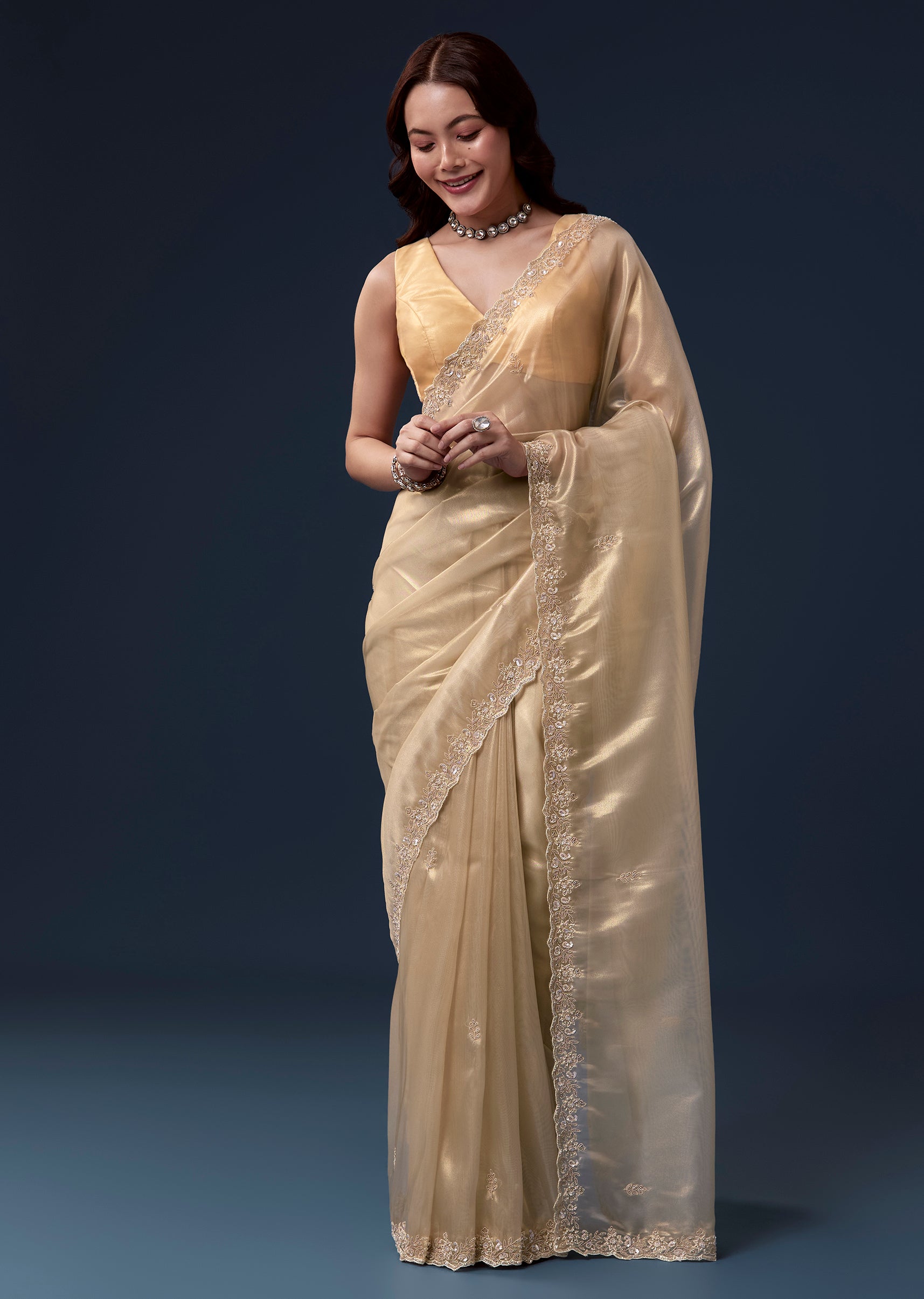 Gold Tissue Saree With Cutdana Beads Sequins And Zardosi Work