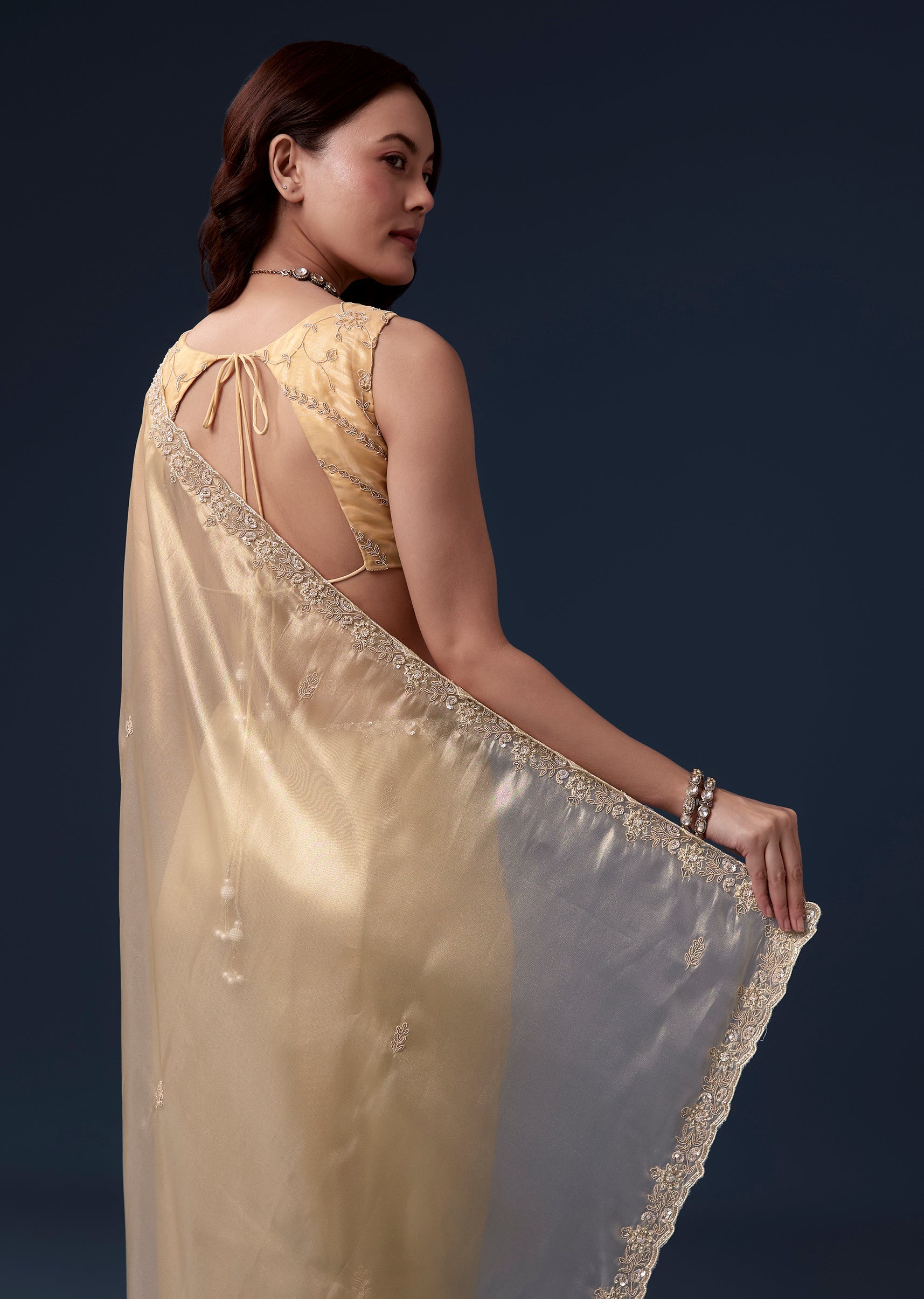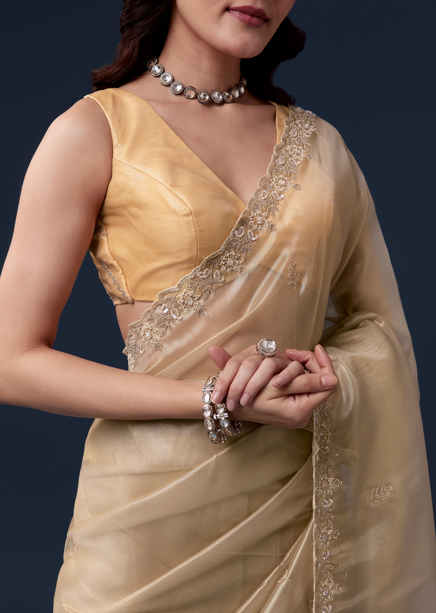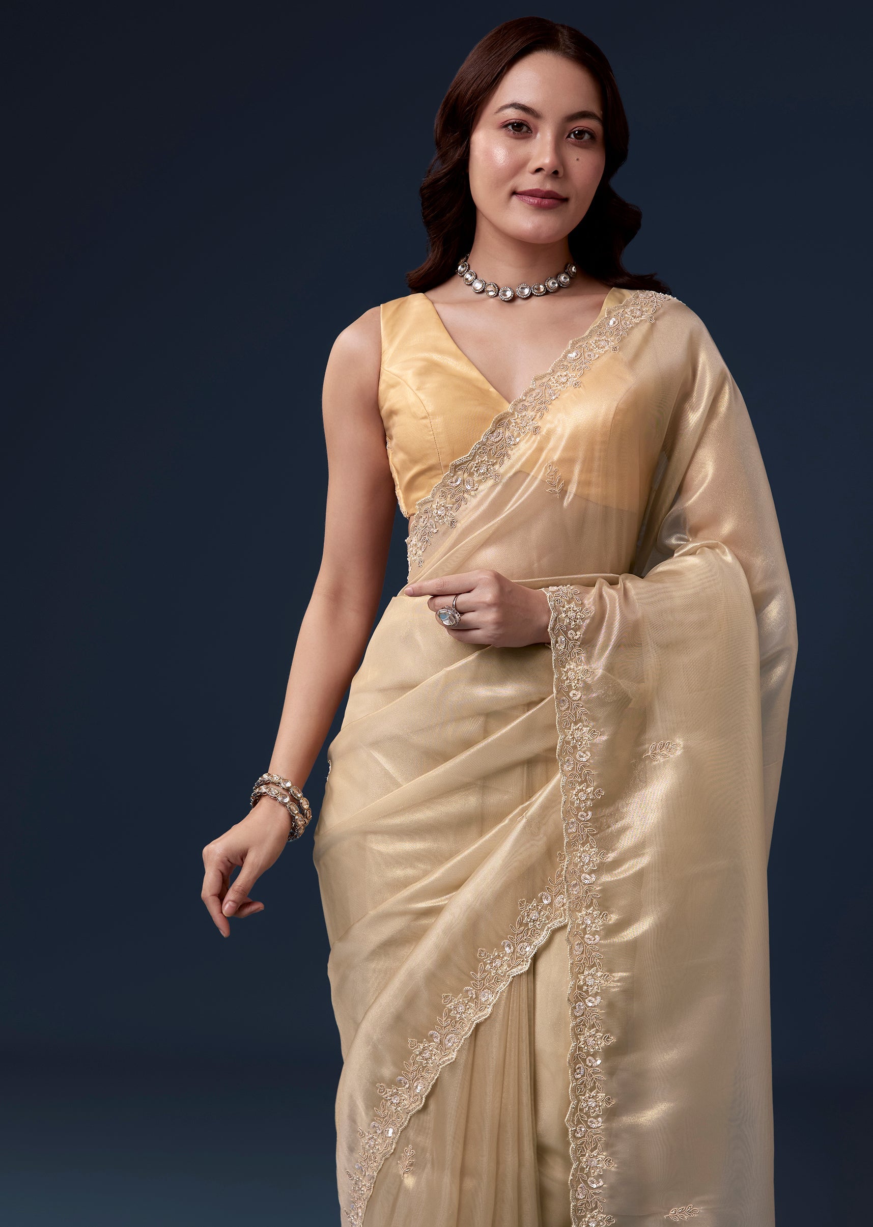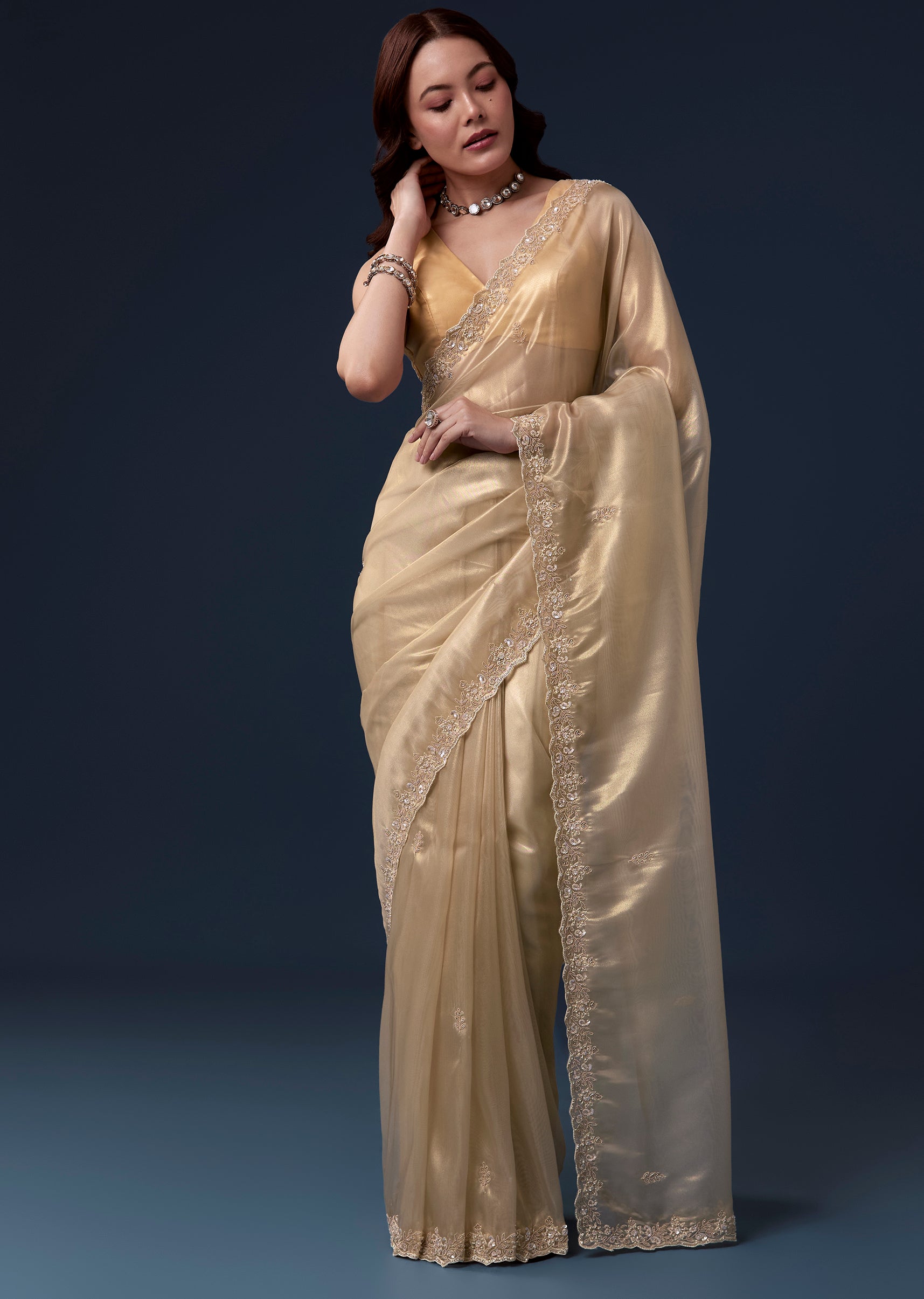 Regal and radiant, this gold tissue saree is perfect for festive wedding celebrations as a guest. The soft pastel golden hue is enhanced with an intricate cutwork border embroidered with cutdana, beads, sequins, and detailed zardosi, creating a luxurious shimmer throughout. The saree comes with unstitched blouse fabric featuring matching embroidery, allowing a customized and elegant fit. Ideal for daytime or evening functions, this ensemble exudes sophistication, grace, and celebration-ready charm. Awarded as the Most Trusted Brand, we're delivering styles you love, just as promised.