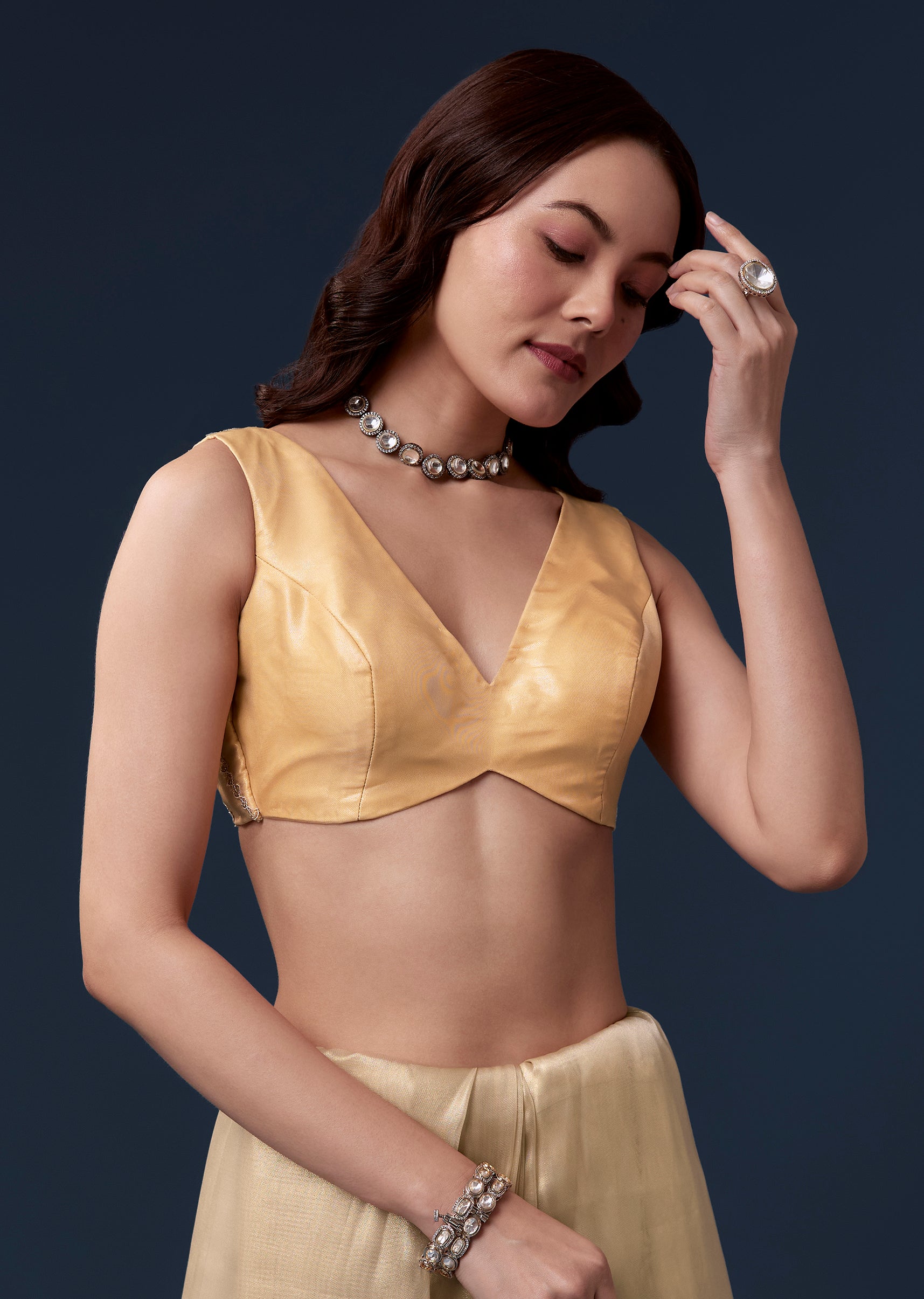 Pair it with statement gold jewelry and metallic heels to highlight the zardosi detailing and elevate the festive elegance.