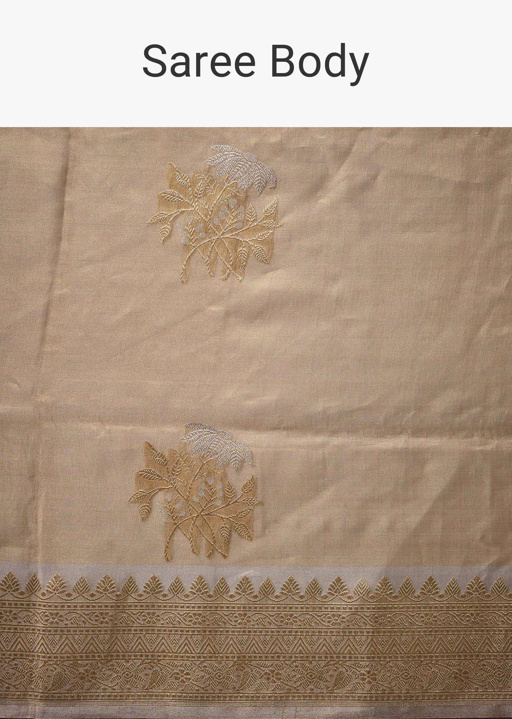 Understated luxury defines this tissue silk saree, beautifully crafted in a warm beige gold tone and woven with a blend of silver and golden zari that adds a soft radiant... More Product Details