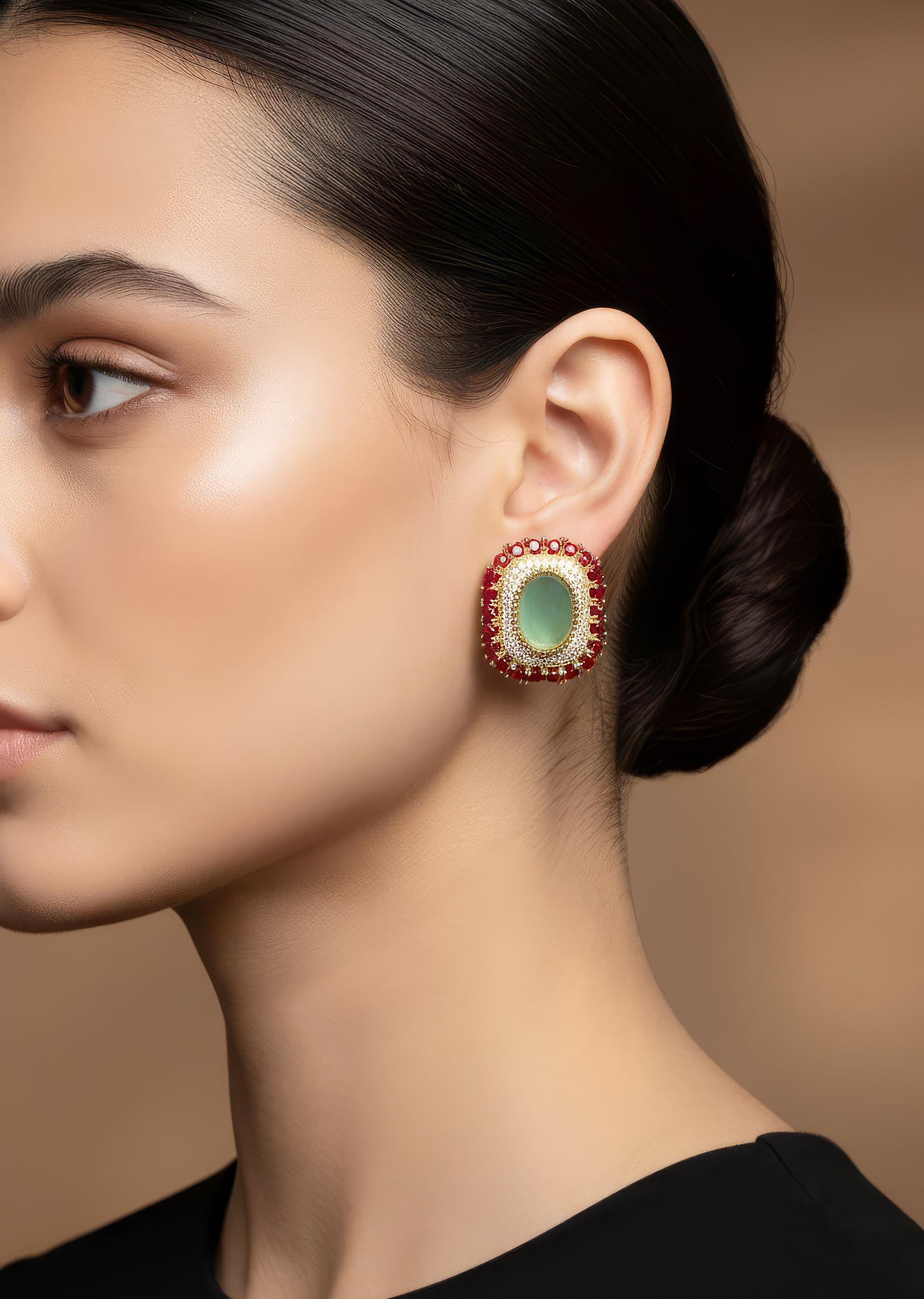 A gold toned square stud earring featuring deep red enamel highlighted with ornate border work. The centre is set with four clear stones arranged in a traditional Kundan style setting that gives the appearance of uncut polki inspired brilliance. Handcrafted with refined detailing this elegant pair brings a rich traditional charm perfect for festive functions wedding celebrations and cultural events.