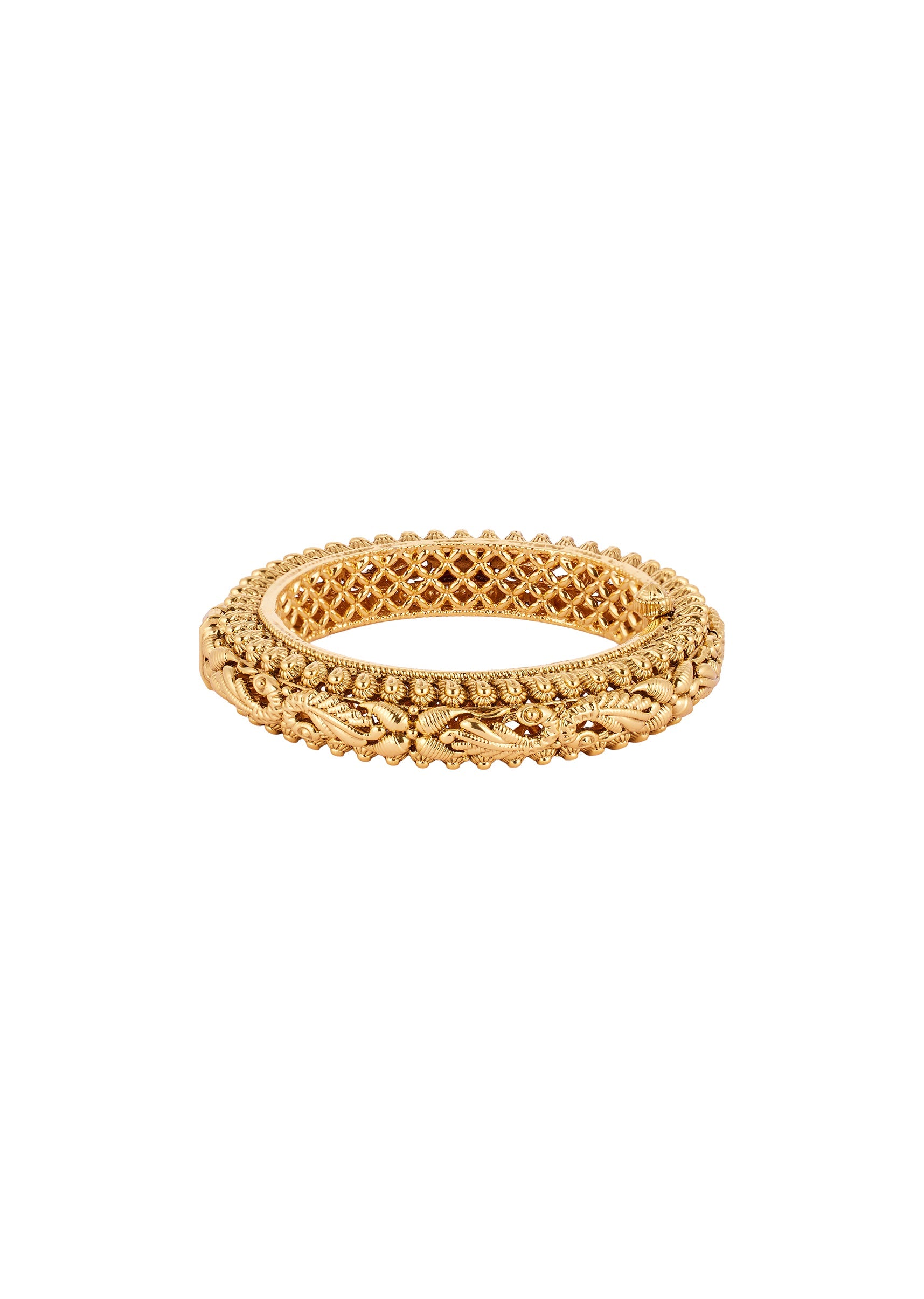 A pair of radiant gold bangles adorned with classic temple motifs and subtle simulated stones. The detailed craftsmanship adds a festive and elegant touch, making these bangles ideal for weddings... More Product Details